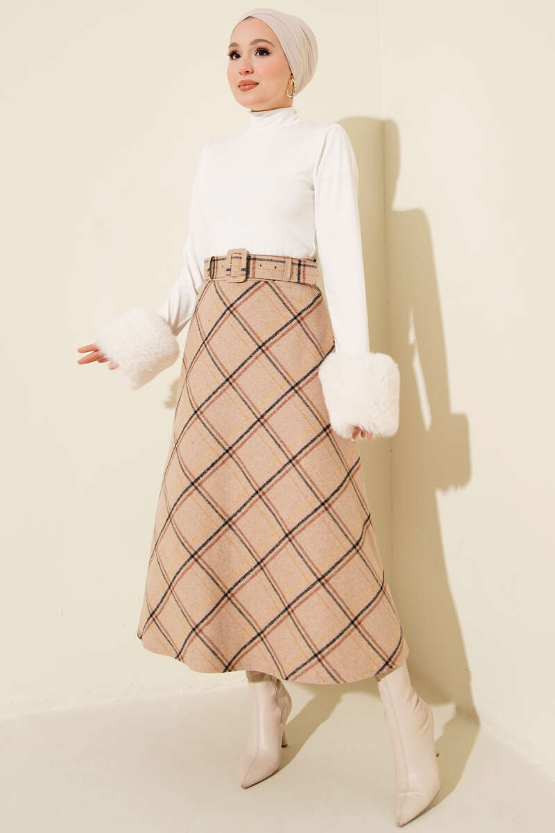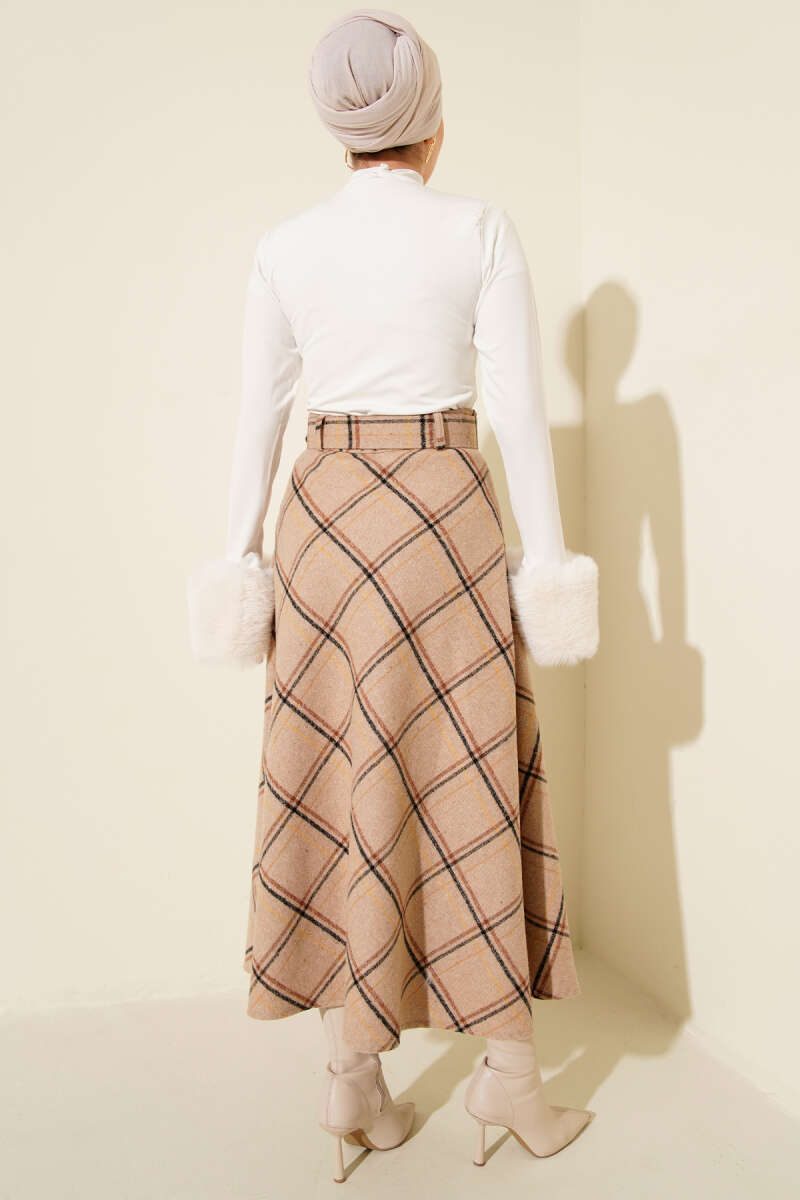 Kare Çizgili Kemerli Kaşe Etek Kahve