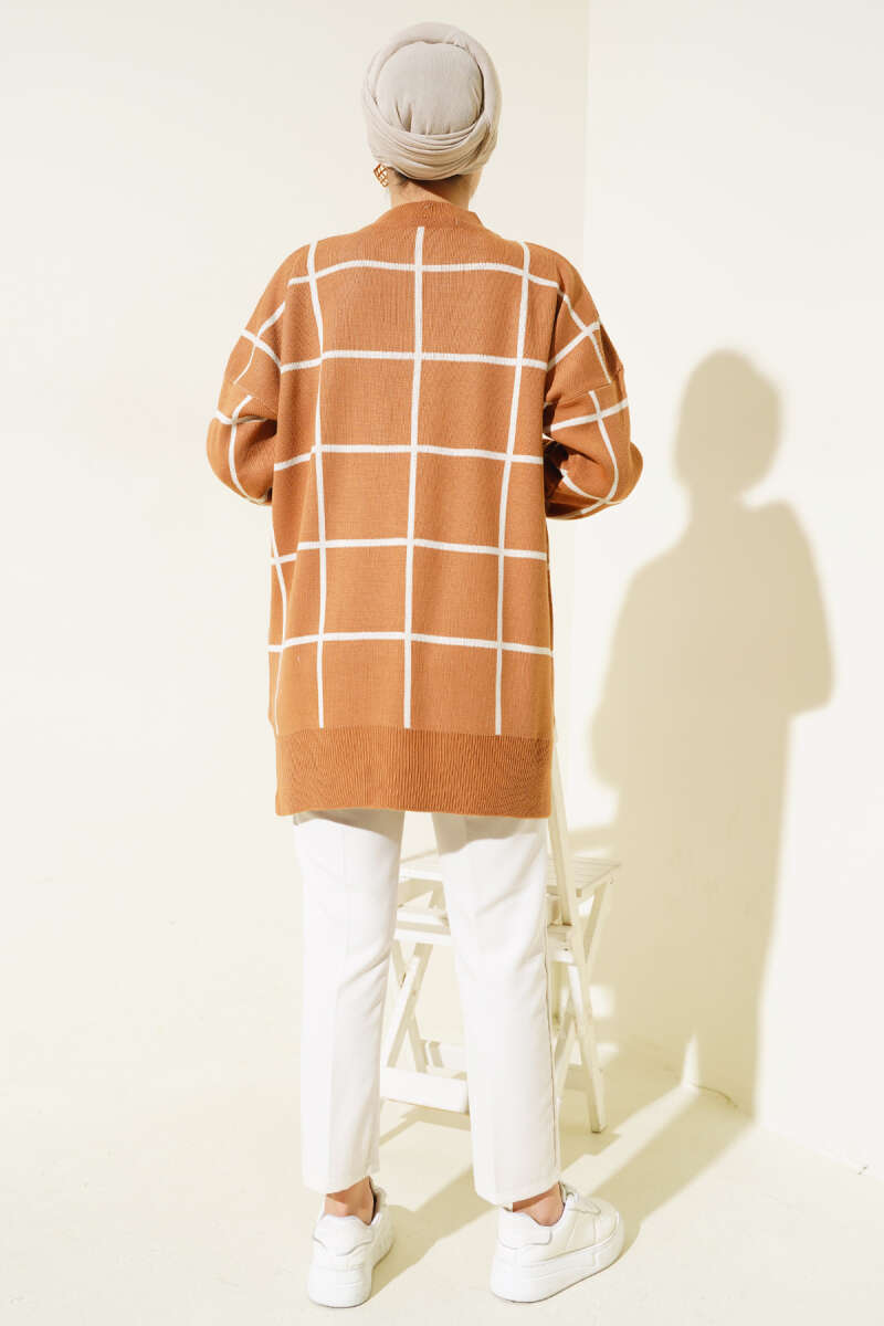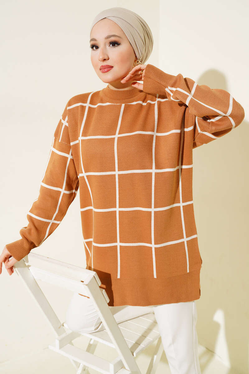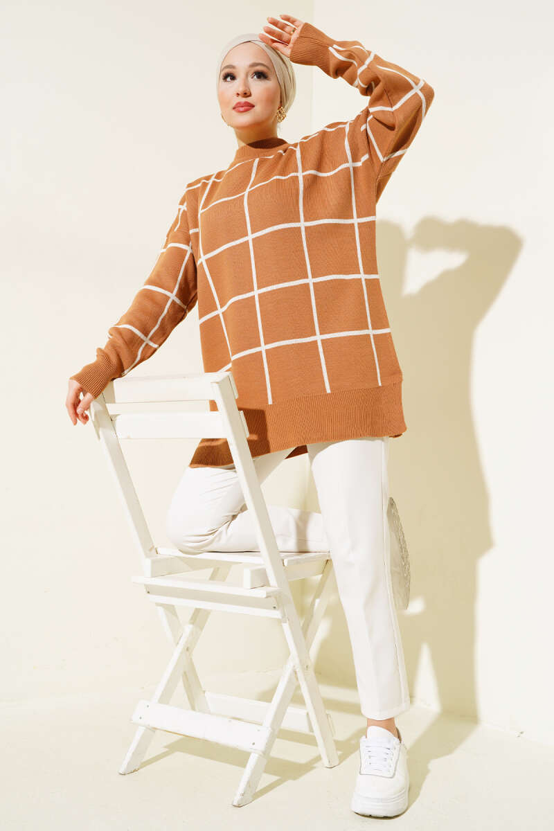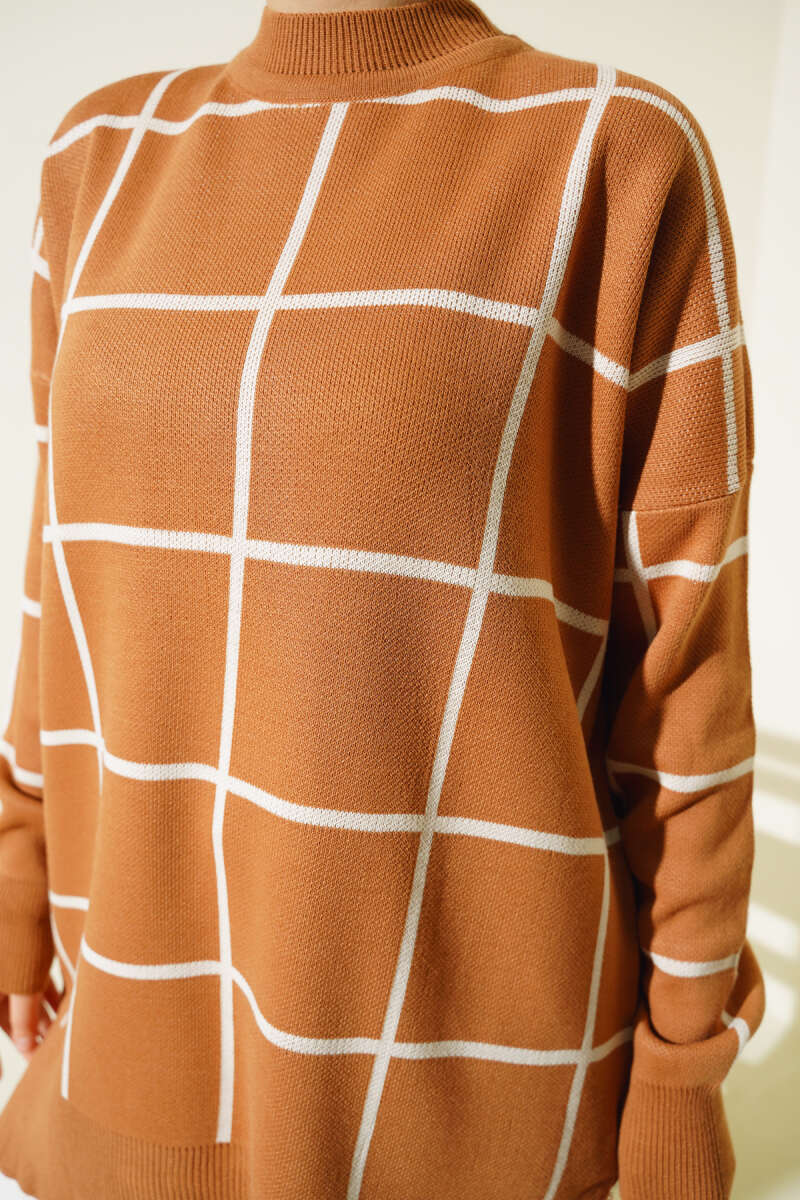 Bilek Düğmeli Fitilli Triko Tunik Kahve