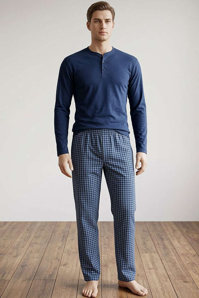Kare Çizgili Uzun Kol Erkek Pijama Takımı İndigo