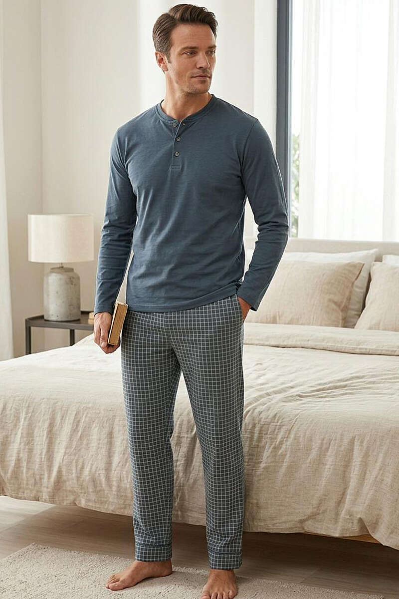 Kare Çizgili Uzun Kol Erkek Pijama Takımı Petrol