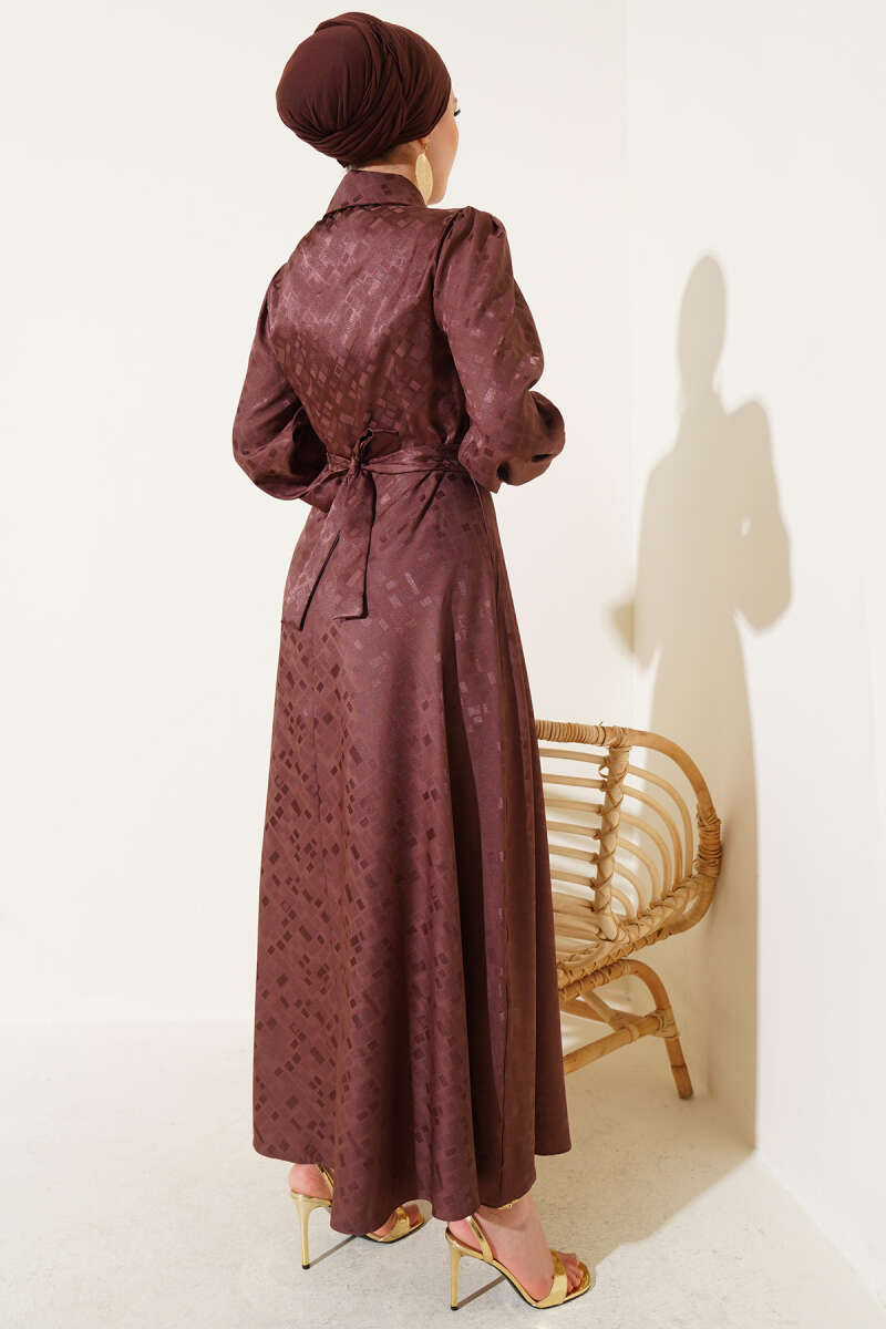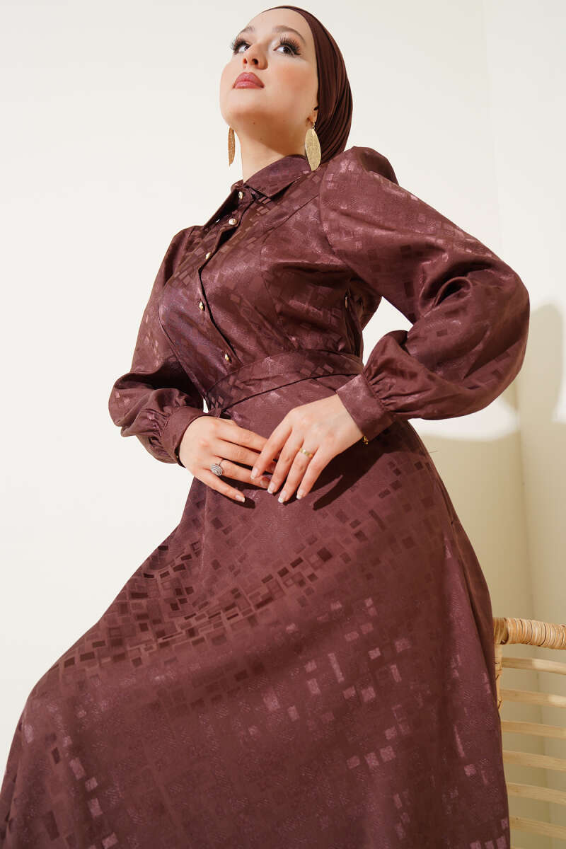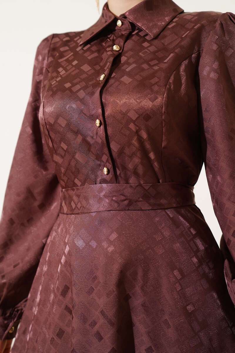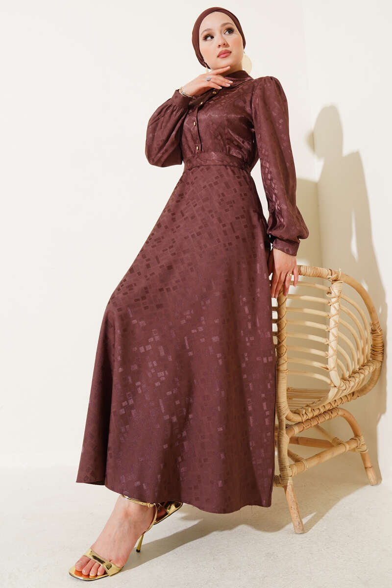 Kare Desen Düğmeli Jakar Elbise Haki