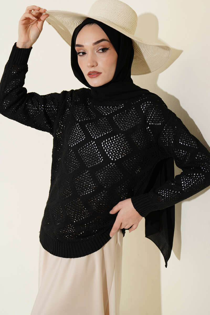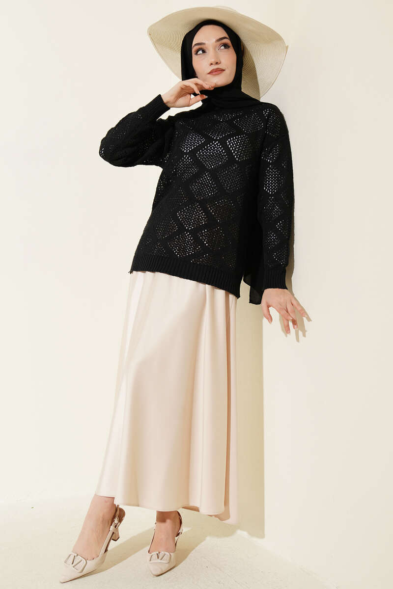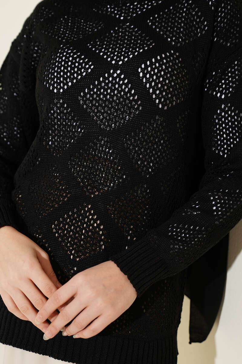 Kare Desenli Ajurlu Triko Kazak Siyah