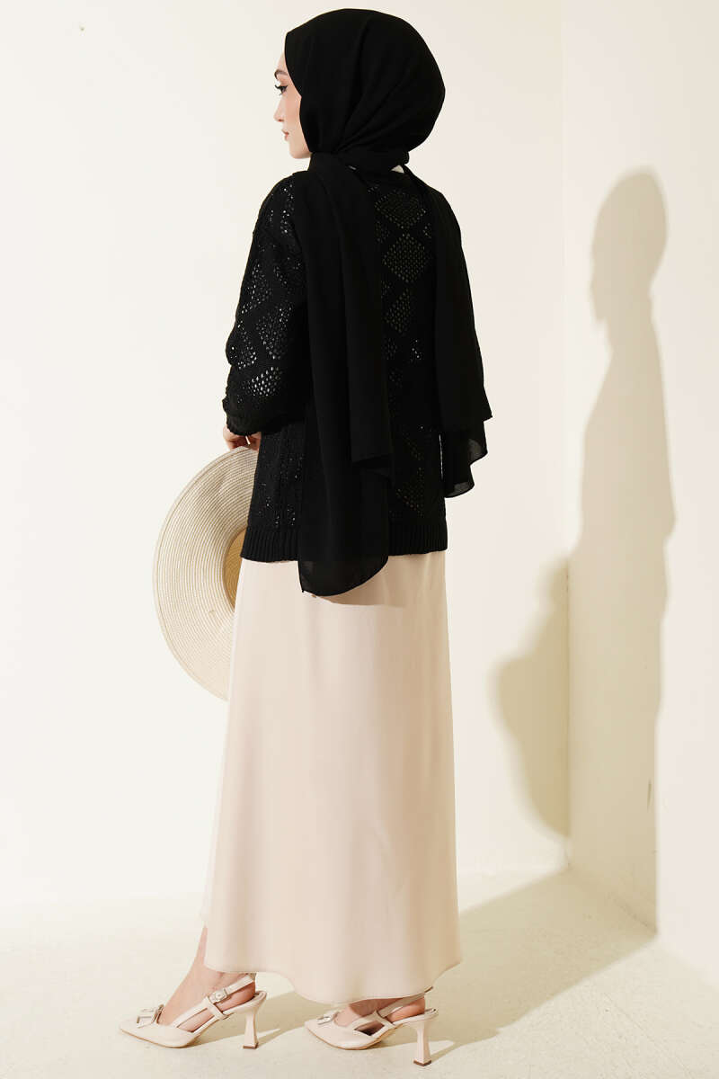 Üzerindeki kare desenli ajur işlemeleriyle dikkat çekici ve havadar bir tasarım sunar. Bisiklet yaka kesimi ve düşük omuz yapısı, ürüne zahmetsiz bir şıklık katarken günlük kullanım için konforlu bir deneyim sağlar. Kol manşetlerinde ve etek ucunda yer alan ribana detayları, kazaktaki desenli yapıyla bütünlük oluşturarak formun korunmasına yardımcı olur.