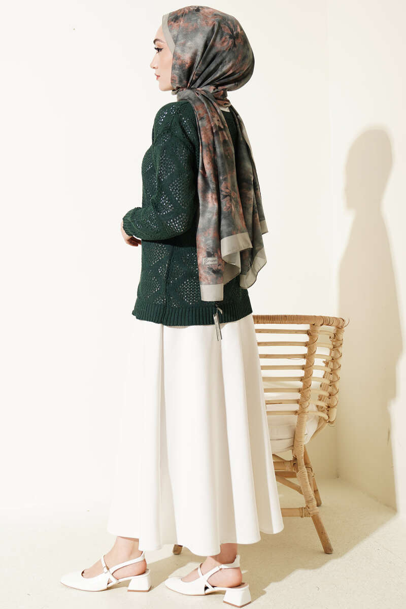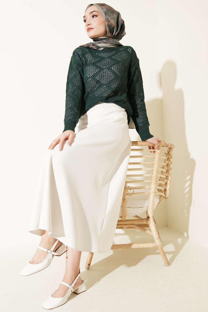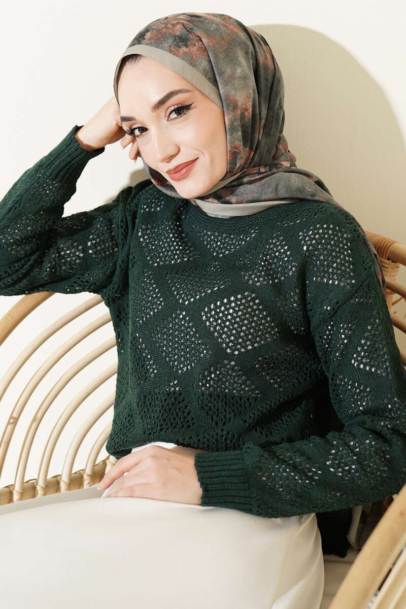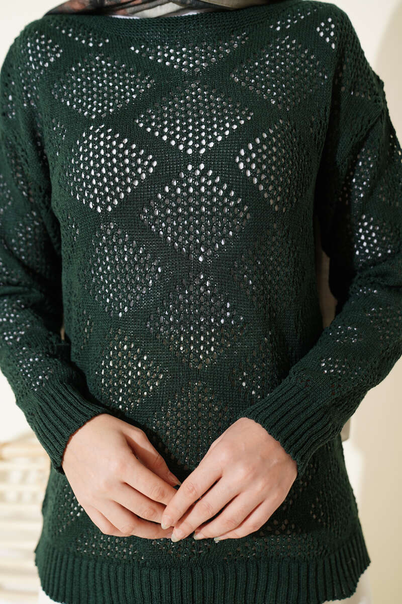 Kare Desenli Ajurlu Triko Kazak Zümrüt