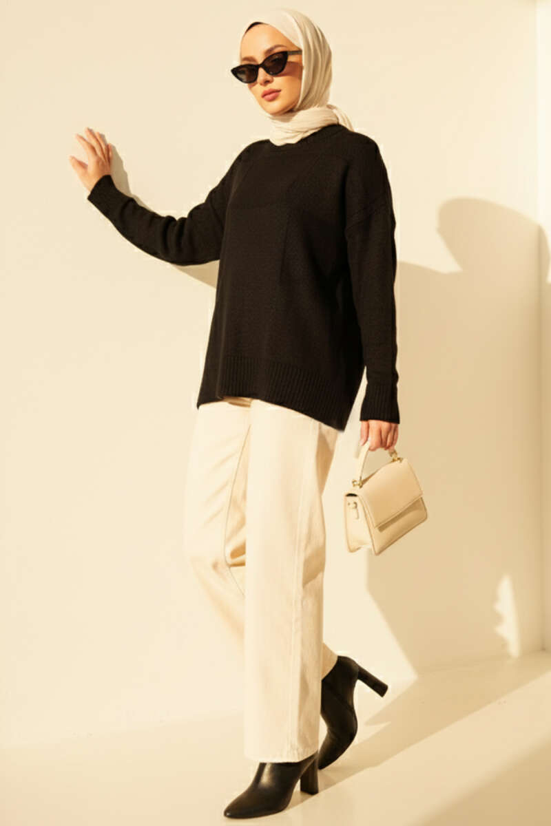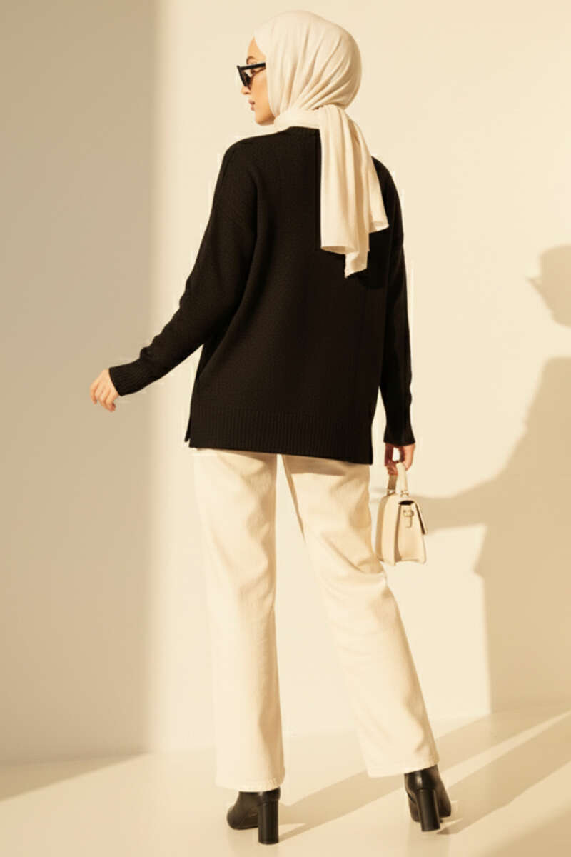 Önü Fırfırlı Triko Kazak Siyah
