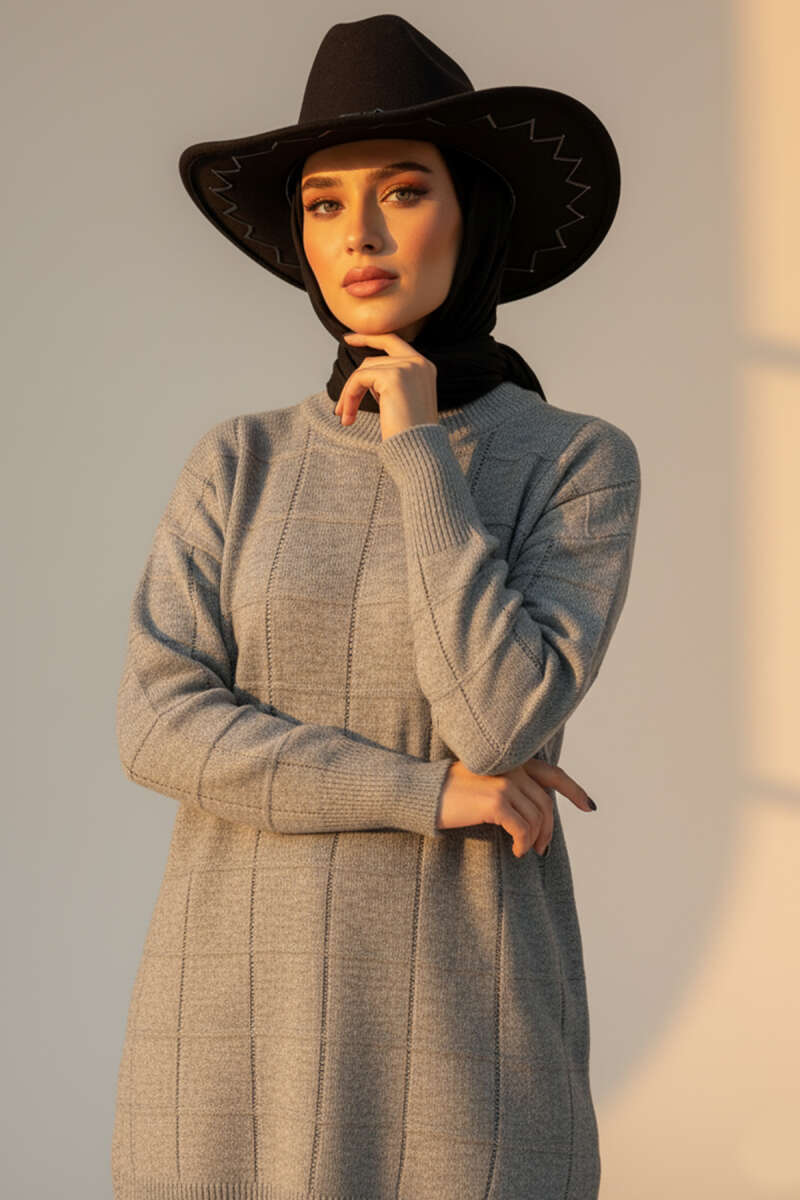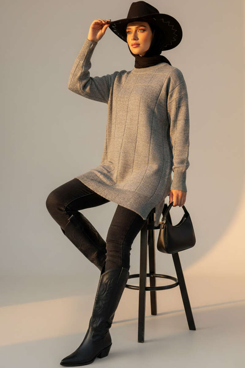 Kare Kabartmalı Yumoş Triko Tunik Gri