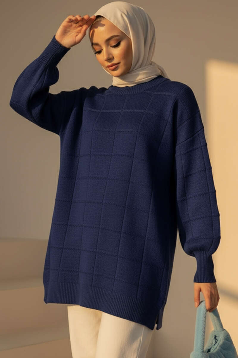 Kare Kabartmalı Yumoş Triko Tunik Lacivert