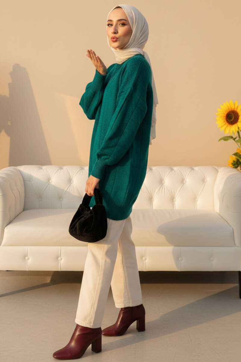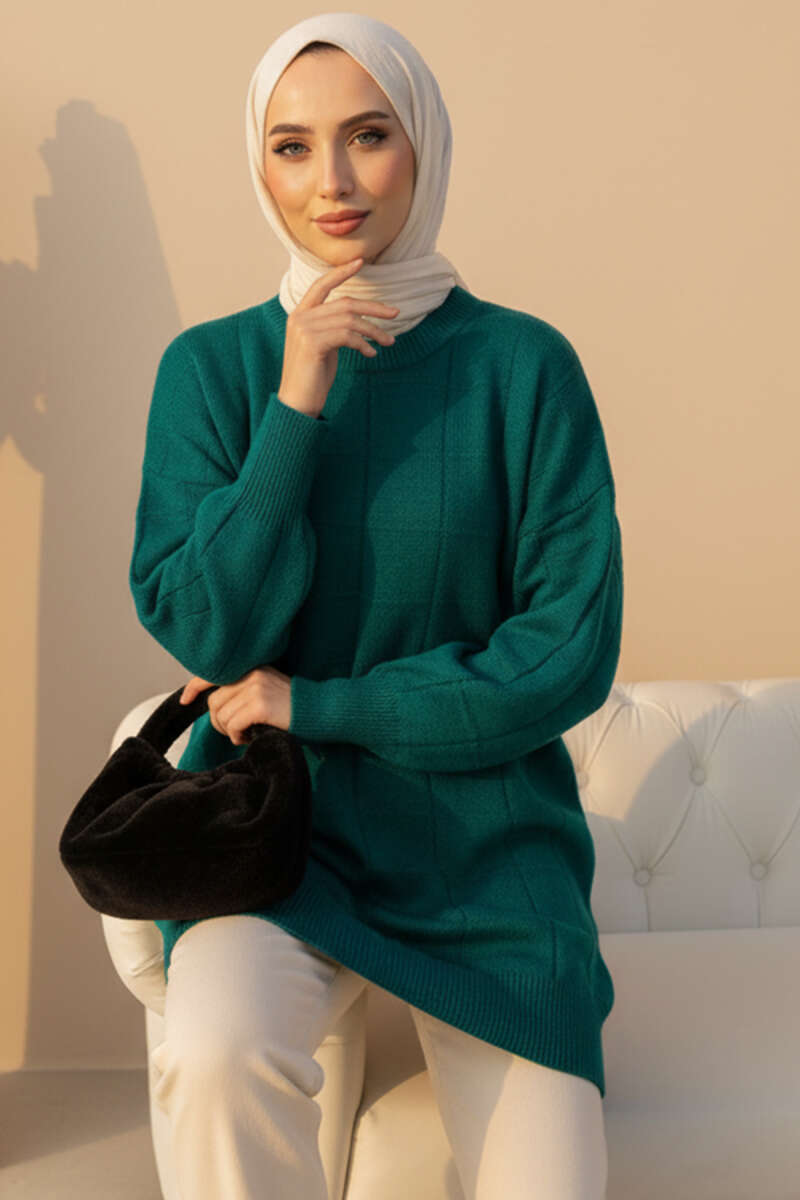 Kare Kabartmalı Yumoş Triko Tunik Yağ Yeşili