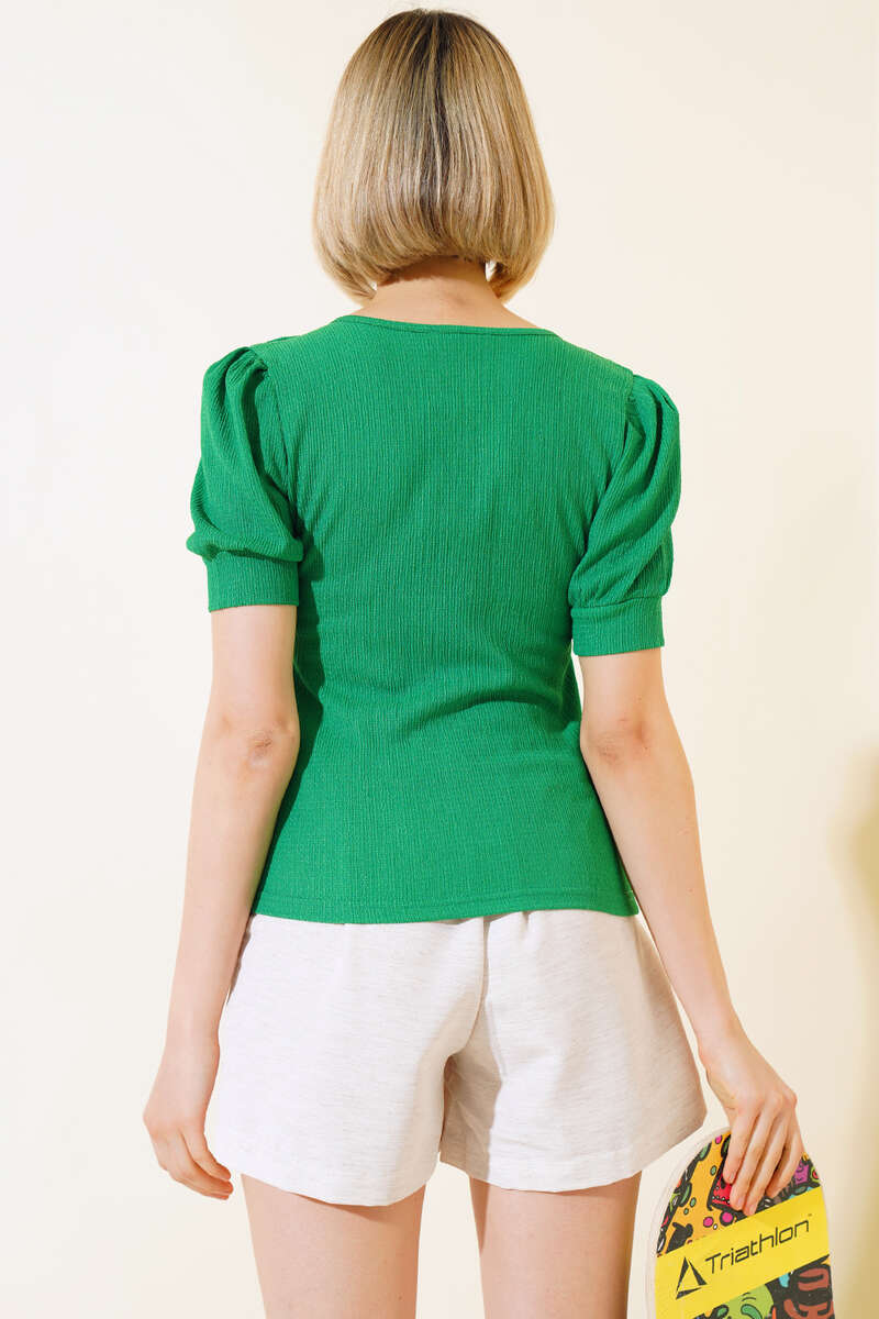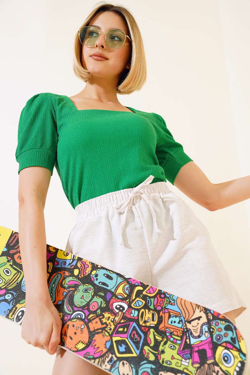 Yeni sezon bluzumuz kare yaka modeldir. Sportif kombinlerinizde tamamlayıcı şık bir parça arıyorsanız doğru ürüne bakıyorsunuz. Kısa kol olan bluzumuzun omuzları büzgü detaylıdır.