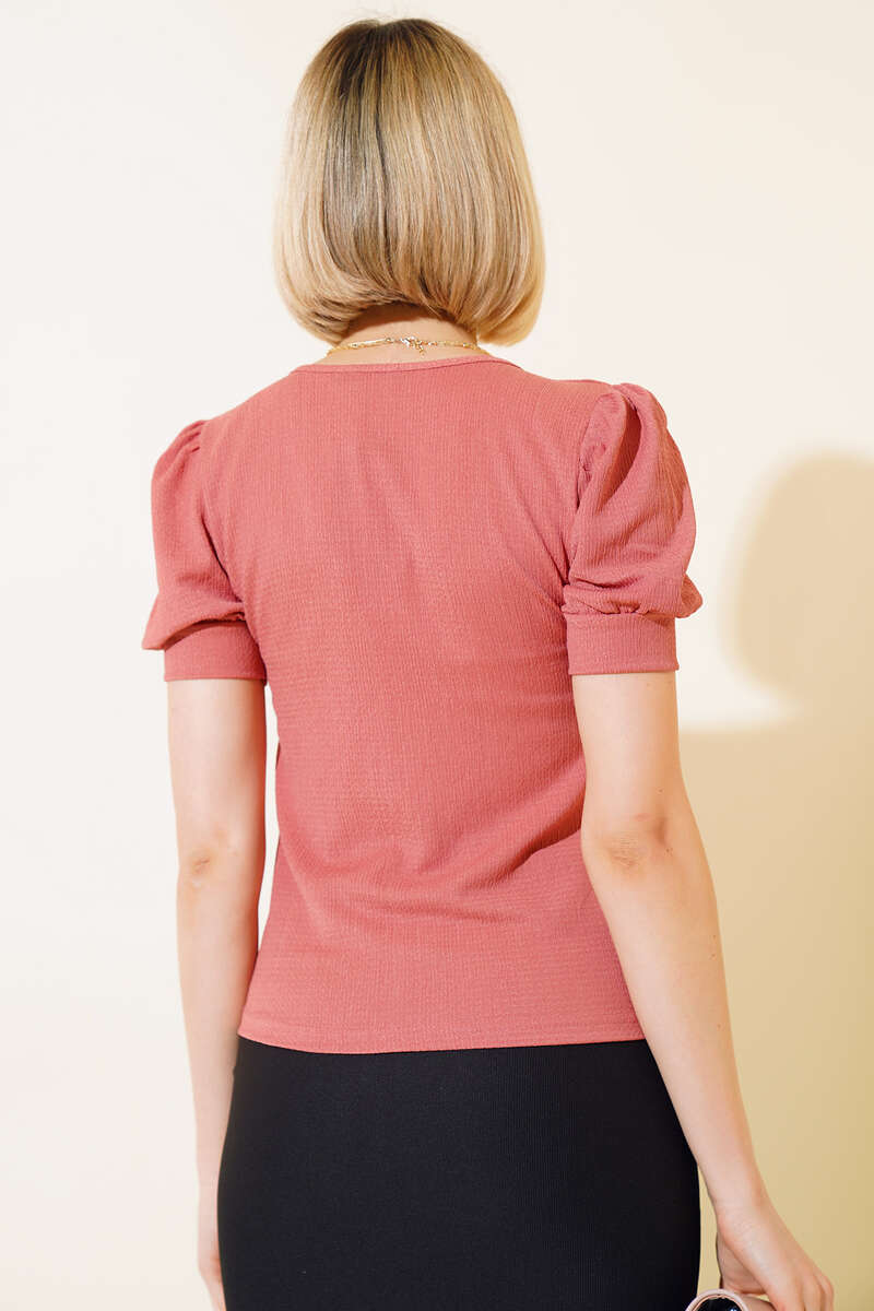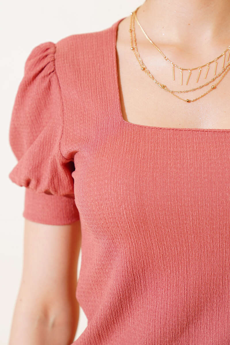 Yeni sezon bluzumuz kare yaka modeldir. Sportif kombinlerinizde tamamlyıcı şık bir parça arıyorsanız doğru ürüne bakıyorsunuz. Kısa kol olan bluzumuzun omuzları büzgü detaylıdır.
