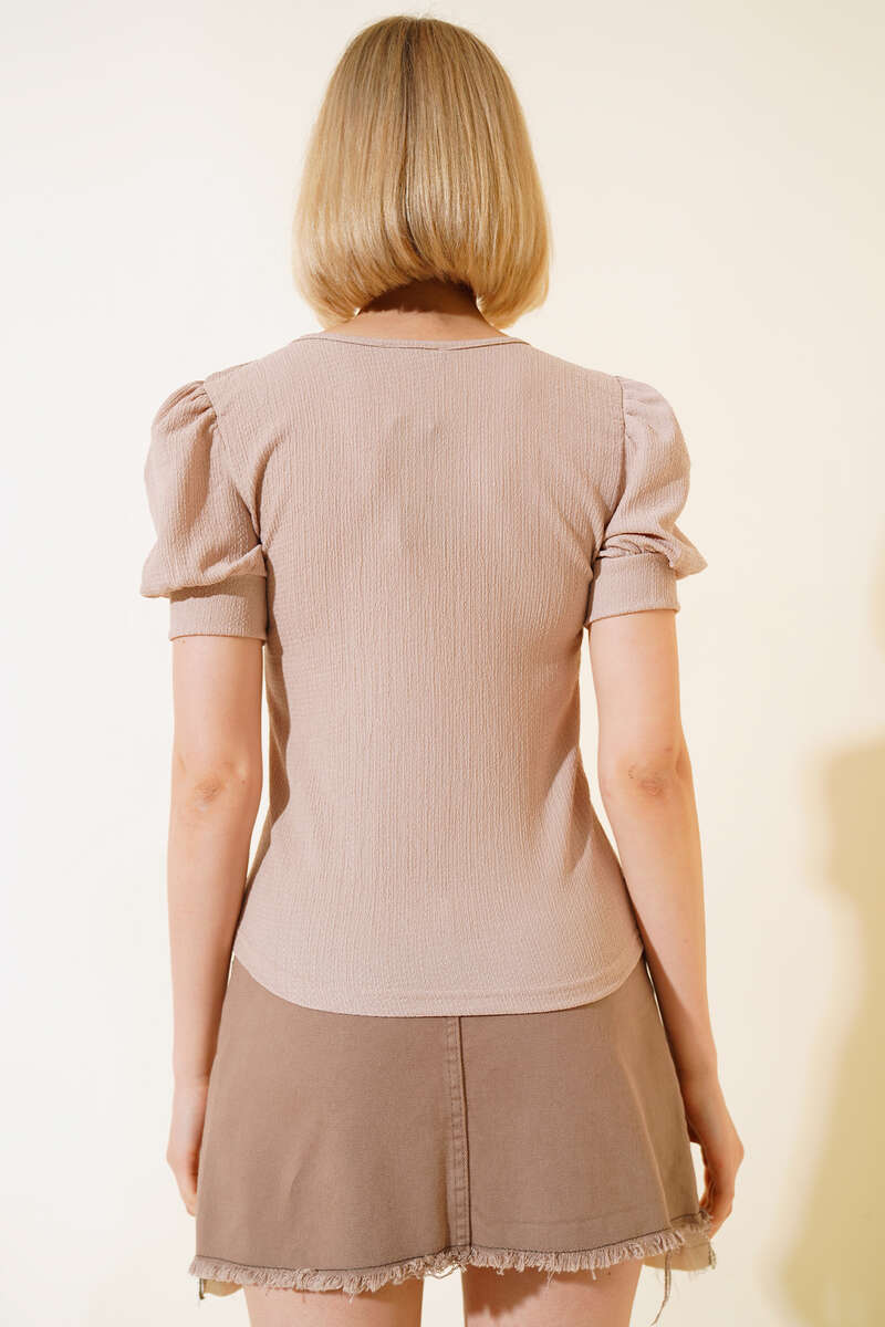 Yeni sezon bluzumuz kare yaka modeldir. Sportif kombinlerinizde tamamlayıcı şık bir parça arıyorsanız doğru ürüne bakıyorsunuz. Kısa kol olan bluzumuzun omuzları büzgü detaylıdır.