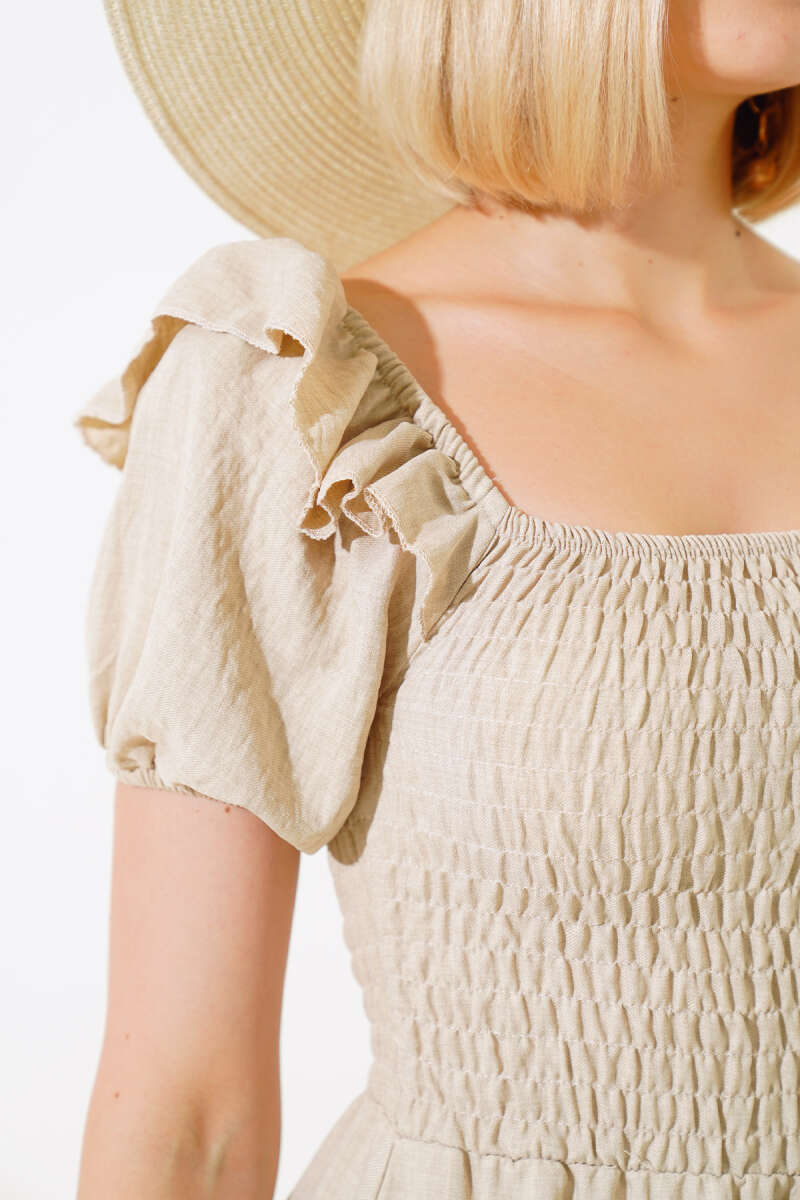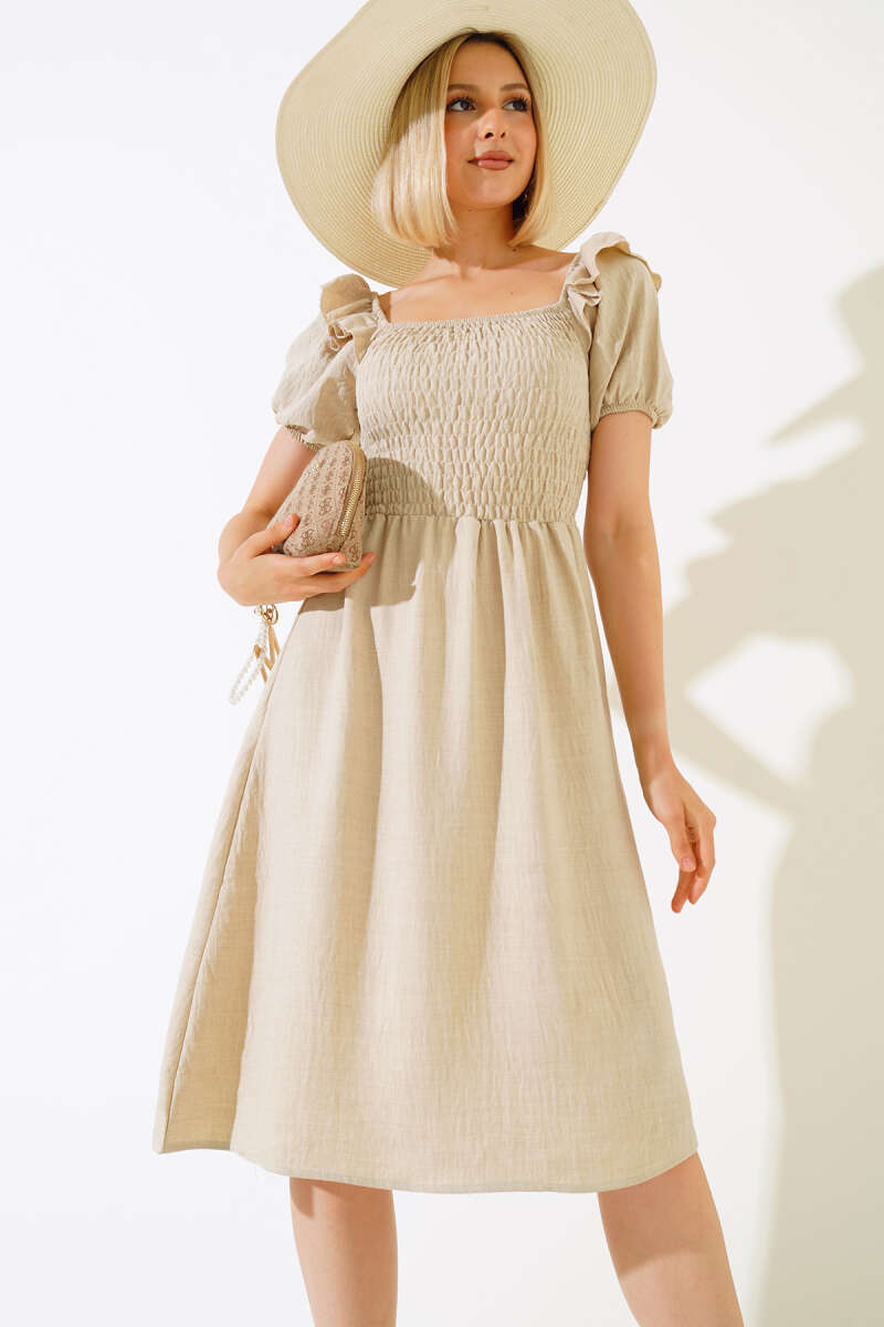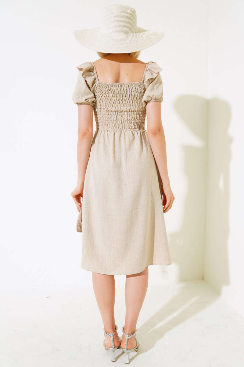 Degaje Yaka Bel Büzgülü Elbise Kahve