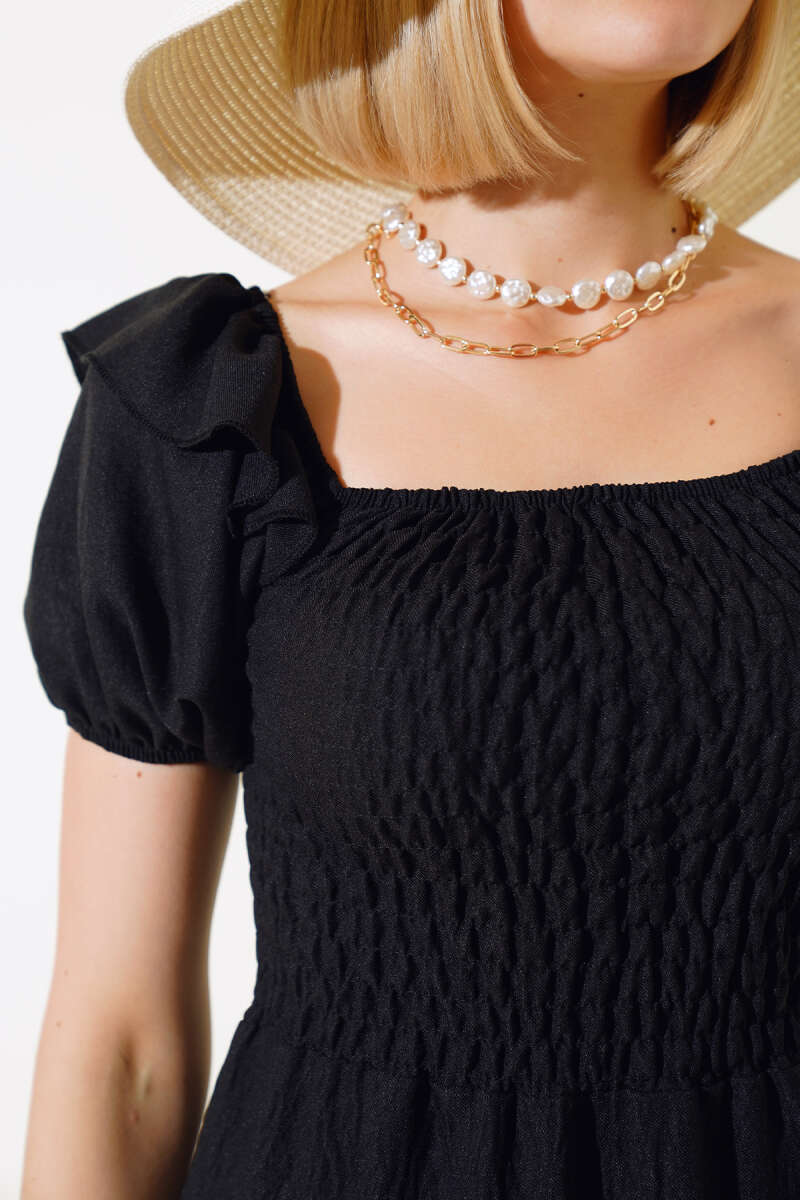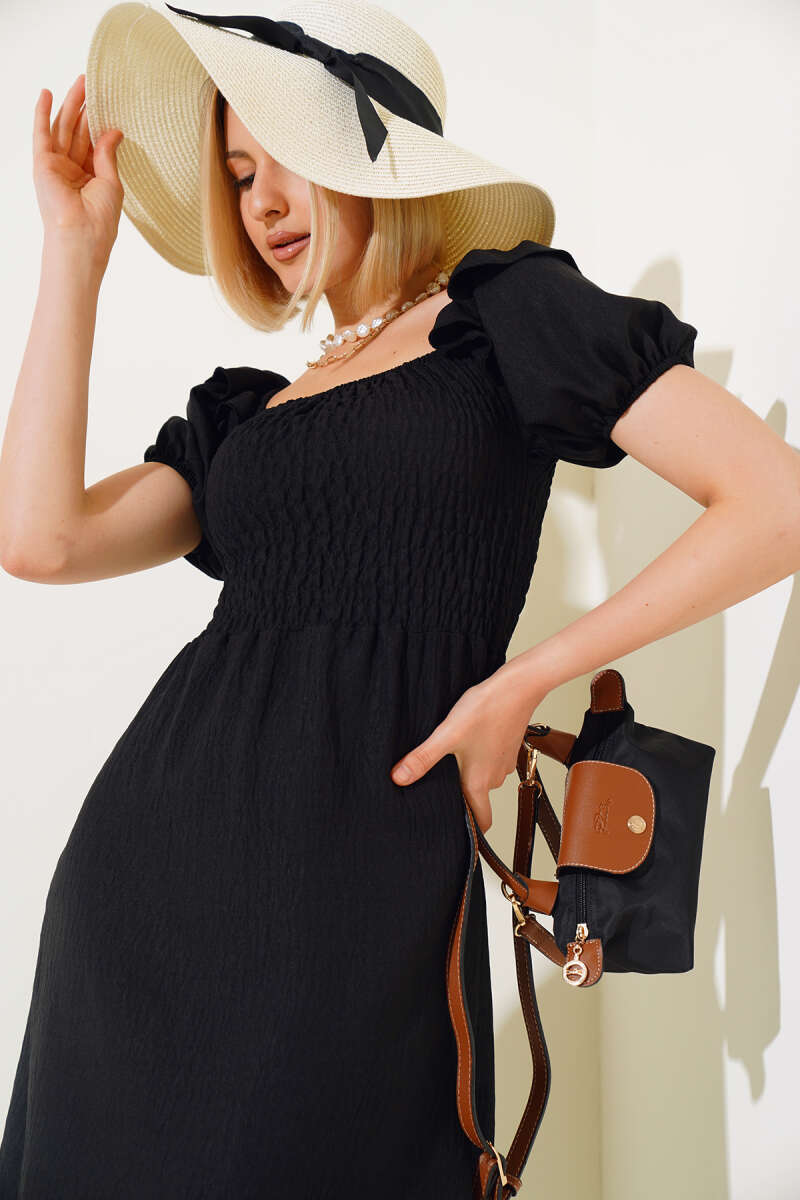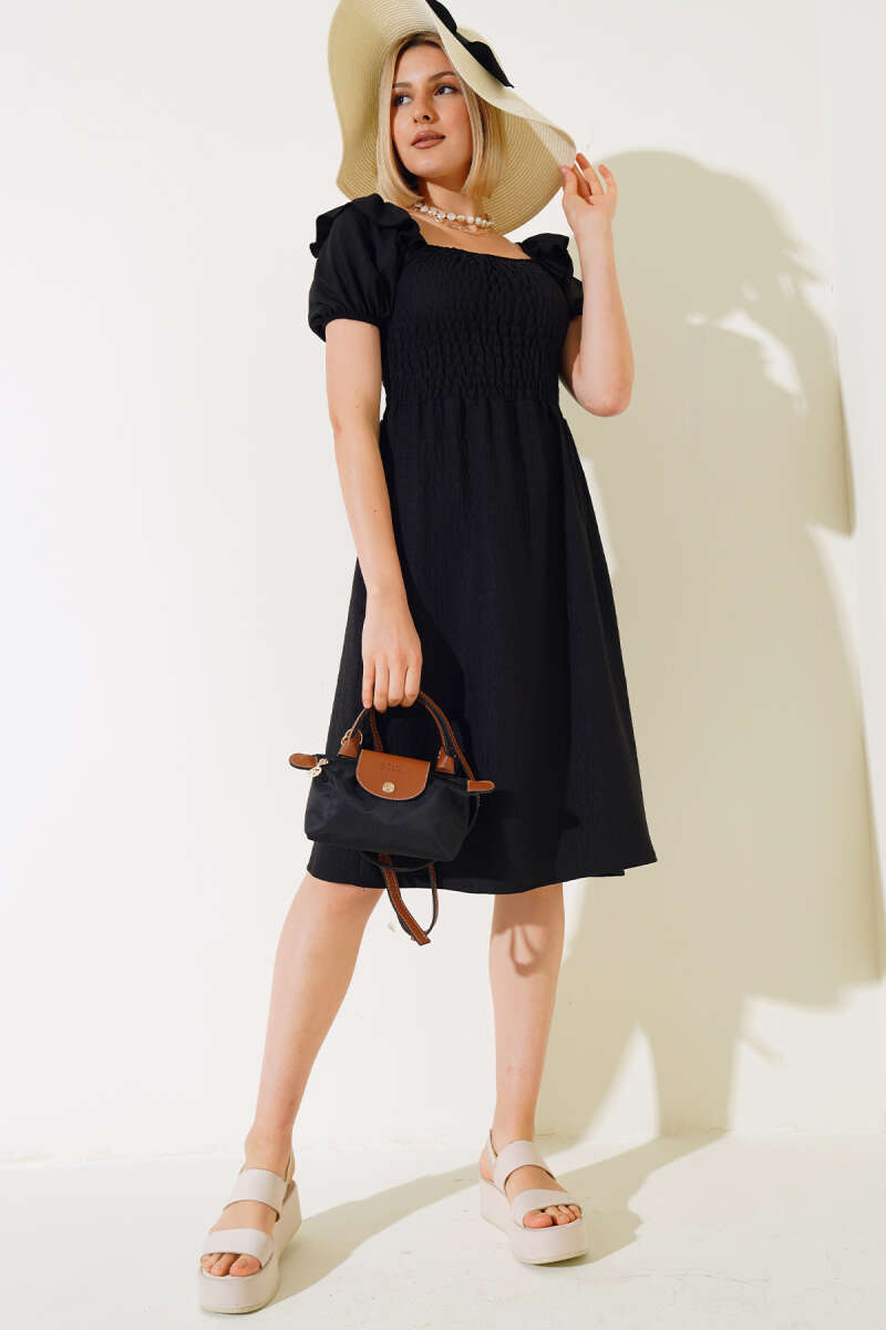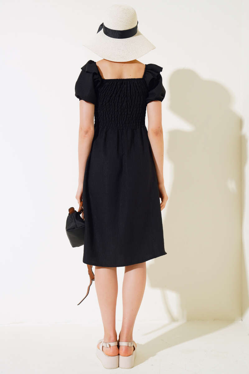 Degaje Yaka Bel Büzgülü Elbise Siyah