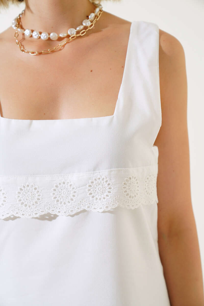 Kare Yaka Güpürlü Elbise Ekru