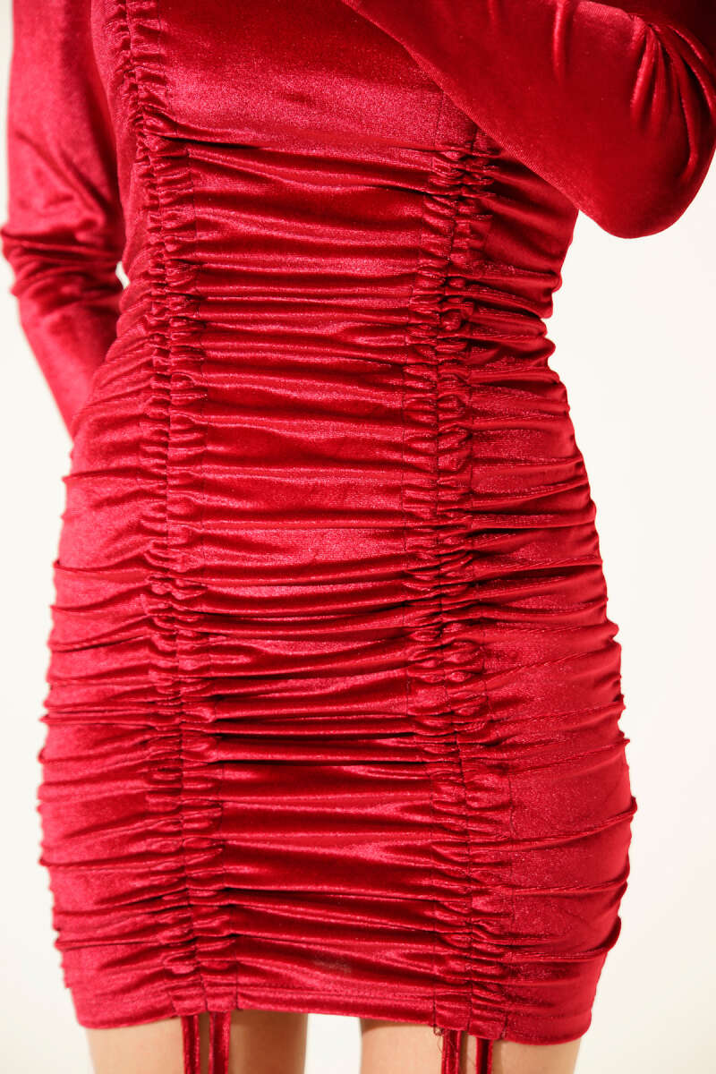 Bel Detaylı Degaje Yaka Kadife Elbise Bordo