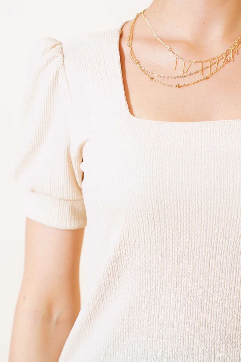 Yeni sezon bluzumuz kare yaka modeldir. Sportif kombinlerinizde tamamlyıcı şık bir parça arıyorsanız doğru ürüne bakıyorsunuz. Kısa kol olan bluzumuzun omuzları büzgü detaylıdır.