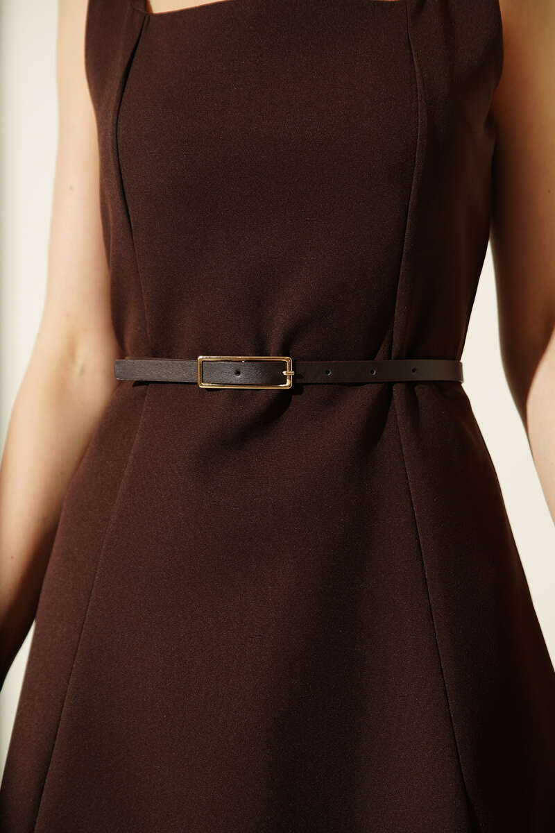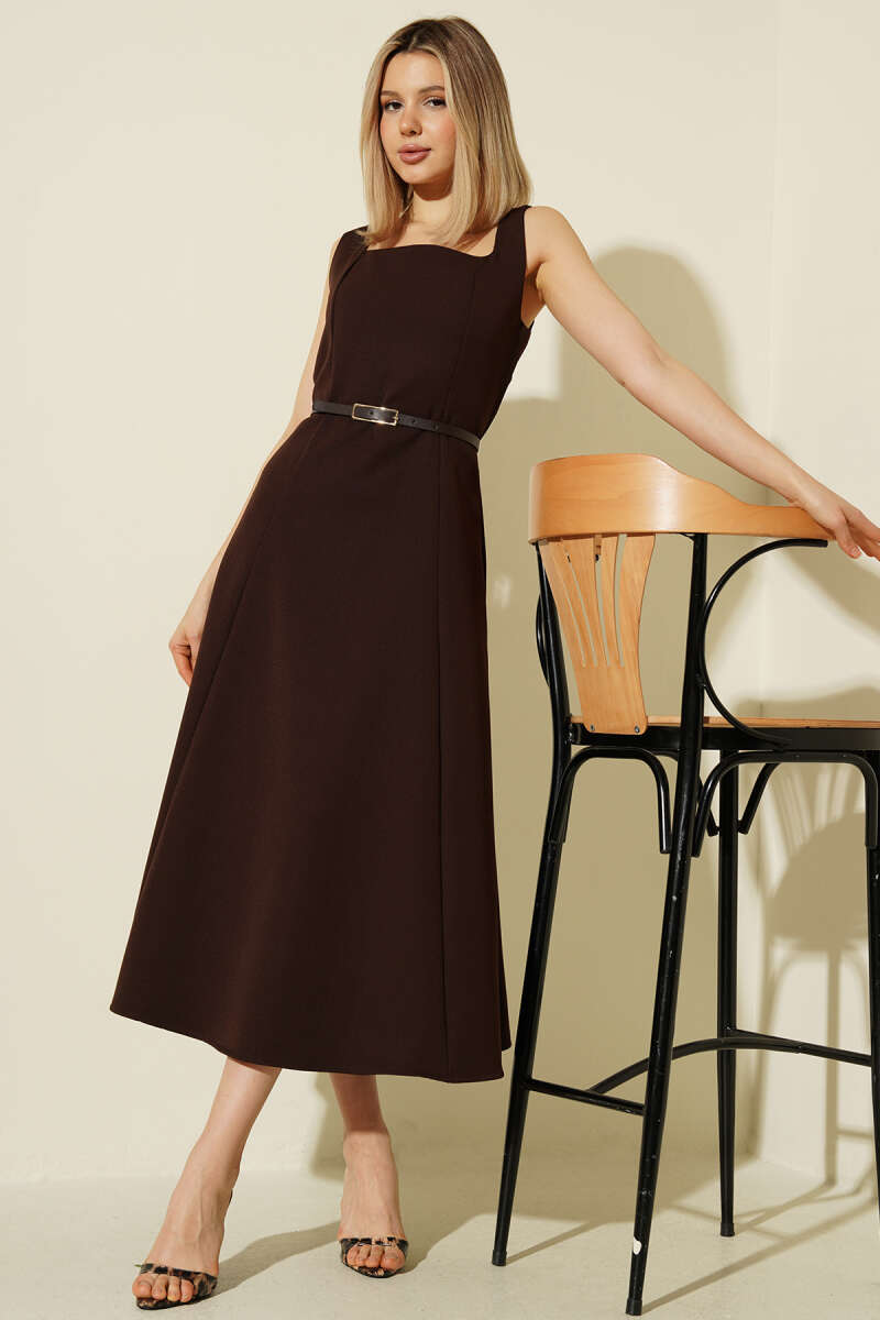 Kare Yaka Kemerli Kumaş Midi Elbise Kahve