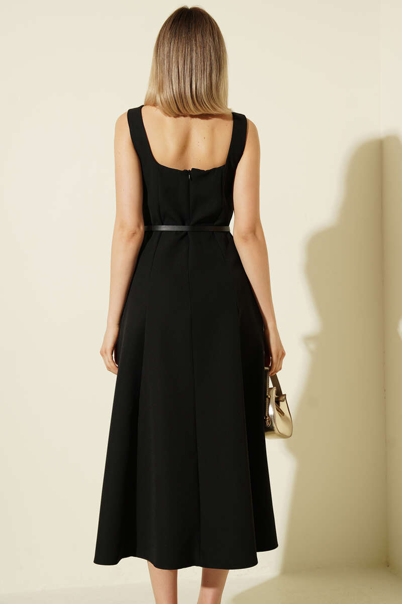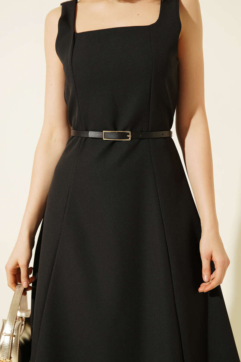 Kare Yaka Kemerli Kumaş Midi Elbise Siyah