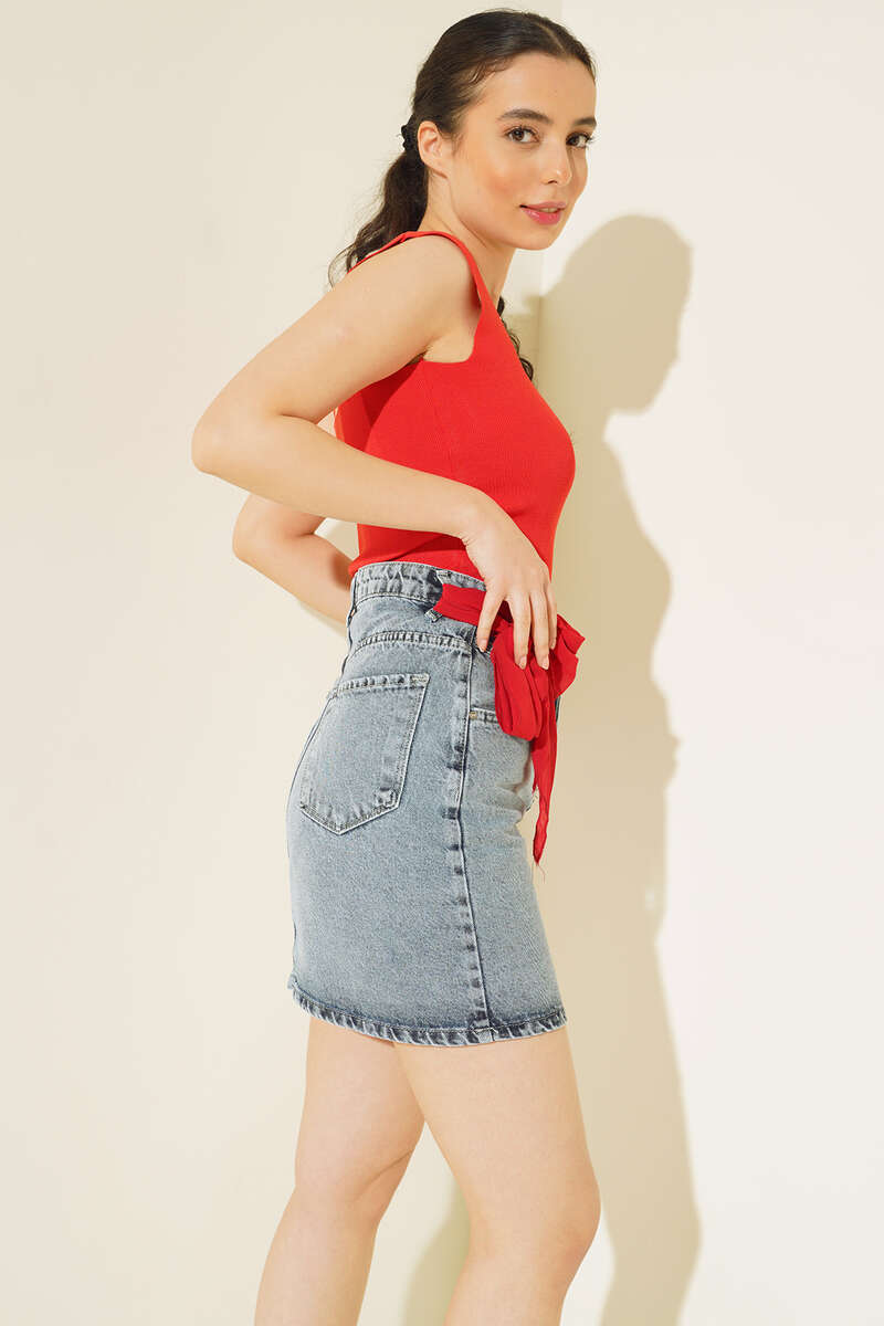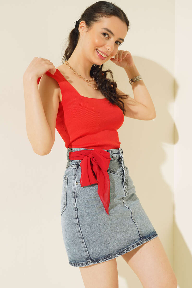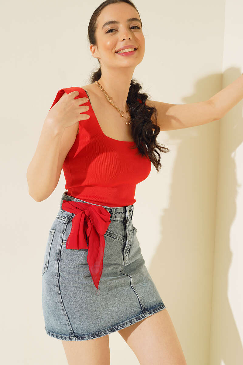Kare Yaka Lazer Kesim Crop Kırmızı