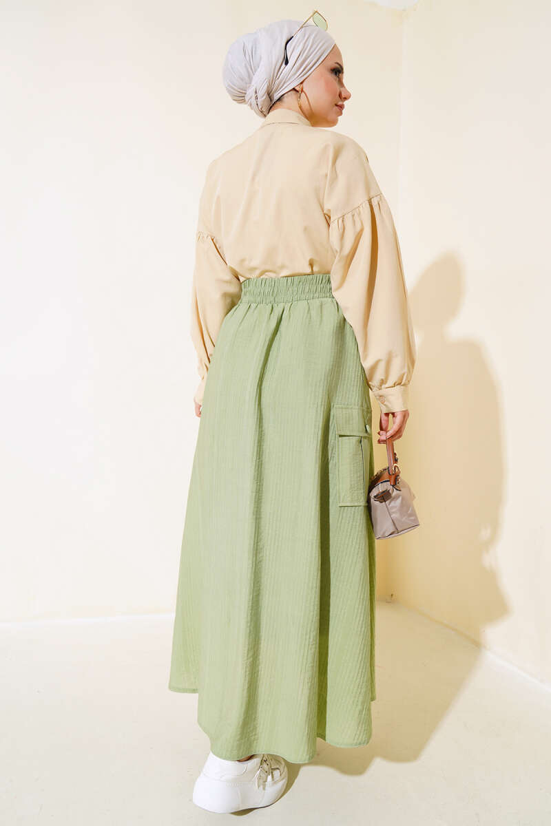 Ekose Desenli Düğmeli Kloş Etek Haki