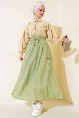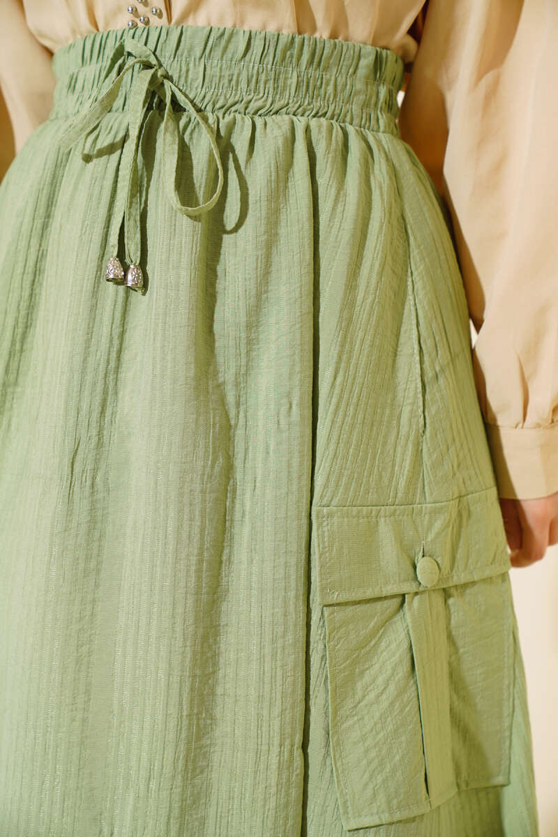 Kemer Aksesuarlı Ekoseli Etek Haki