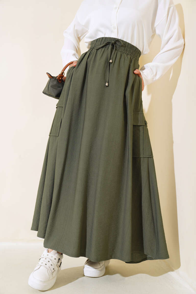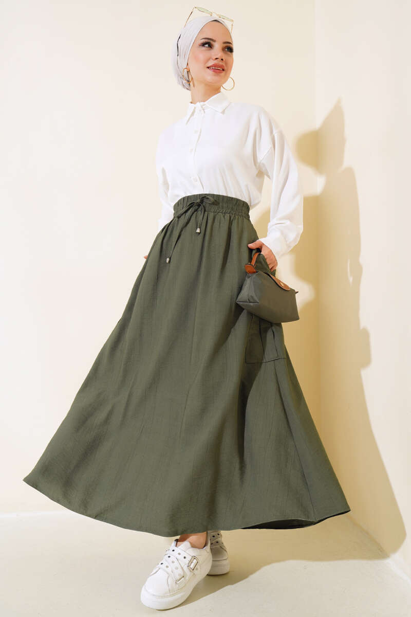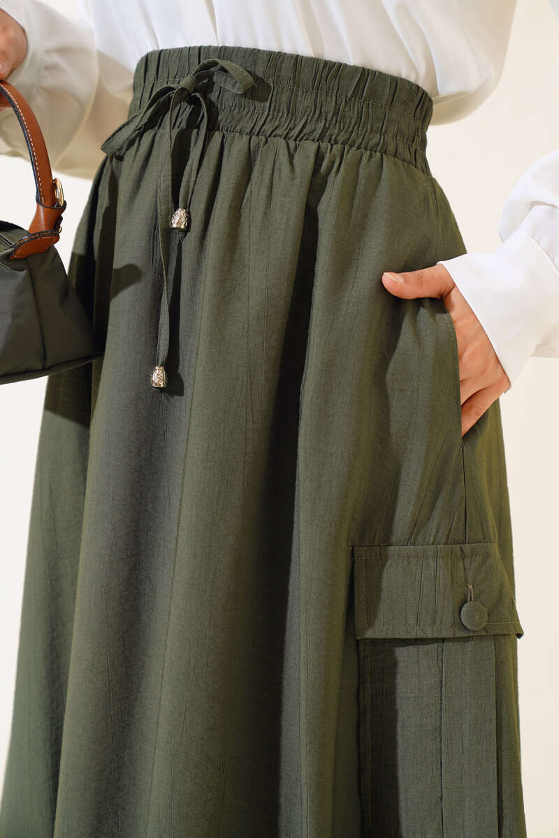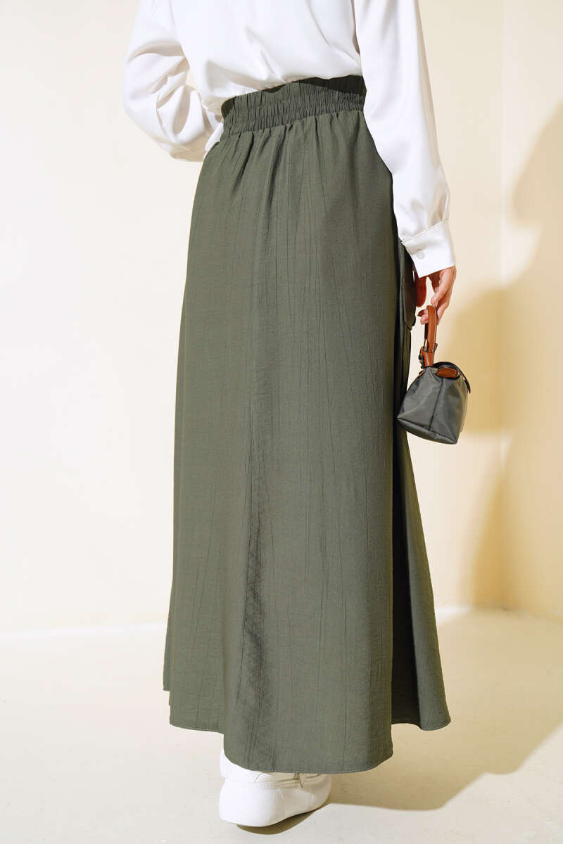 Ekose Desenli Düğmeli Kloş Etek Haki