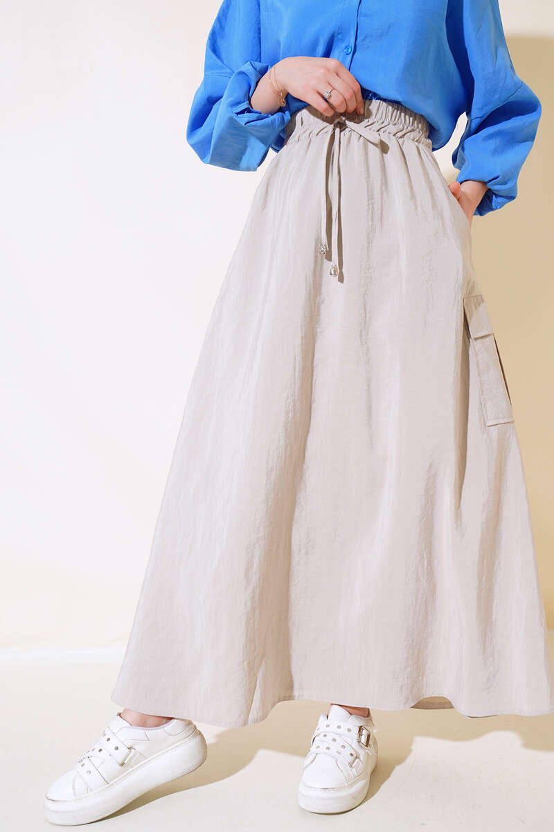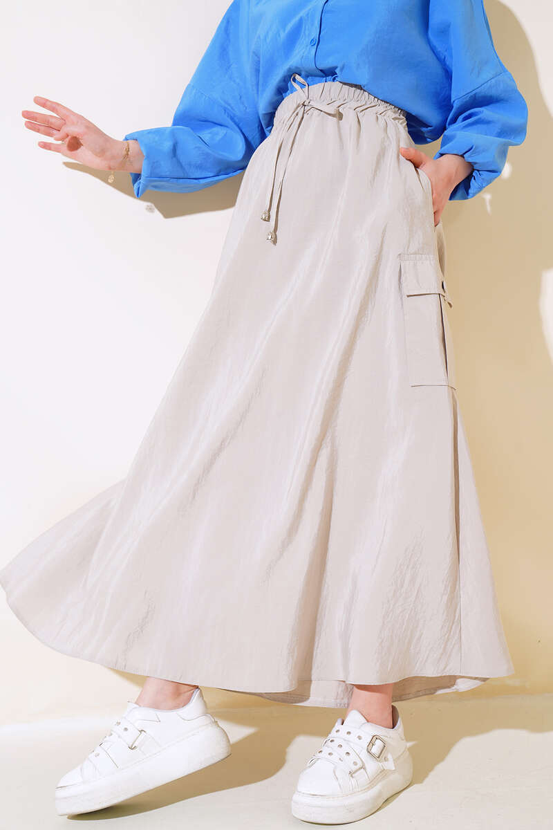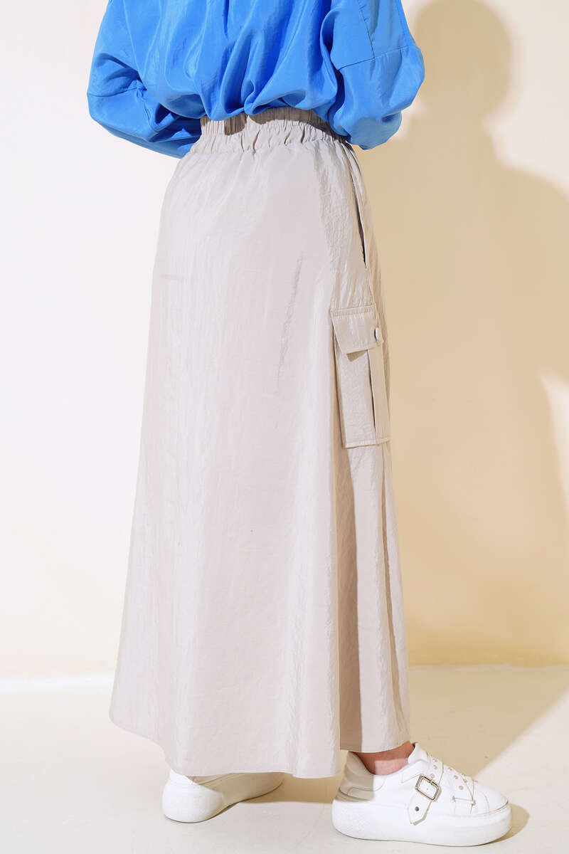 Yeni sezon etek modelimiz size çok yakışacak. İki adet düğmeli kapaklı kargo cep bulunmaktadır. Kloş modeldir. Belden lastiklidir. İçi astarlıdır. İki adet yan cebi bulunmaktadır. Eteğimizin renk seçenekleri mevcuttur.
