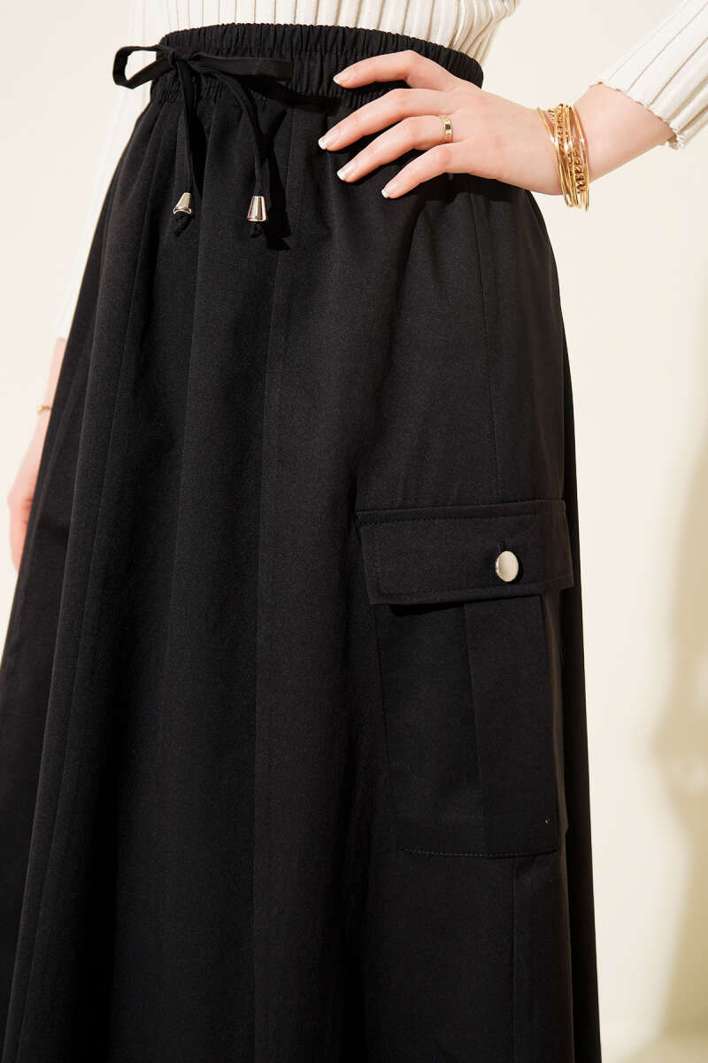 Çizgili Bel Lastikli Saten Etek Siyah