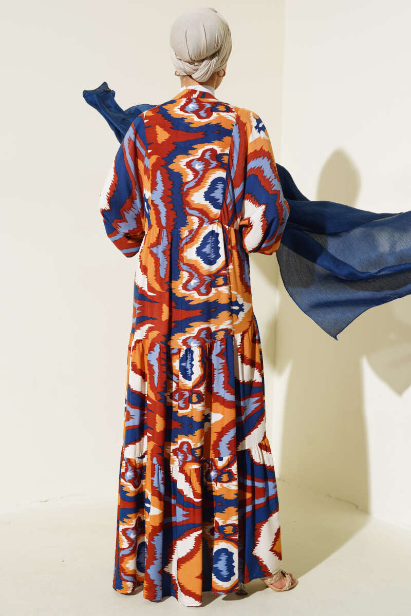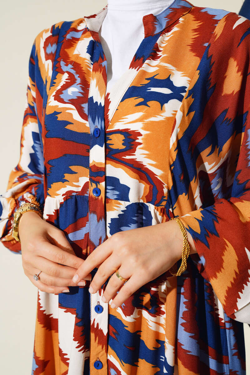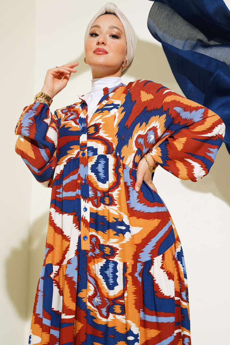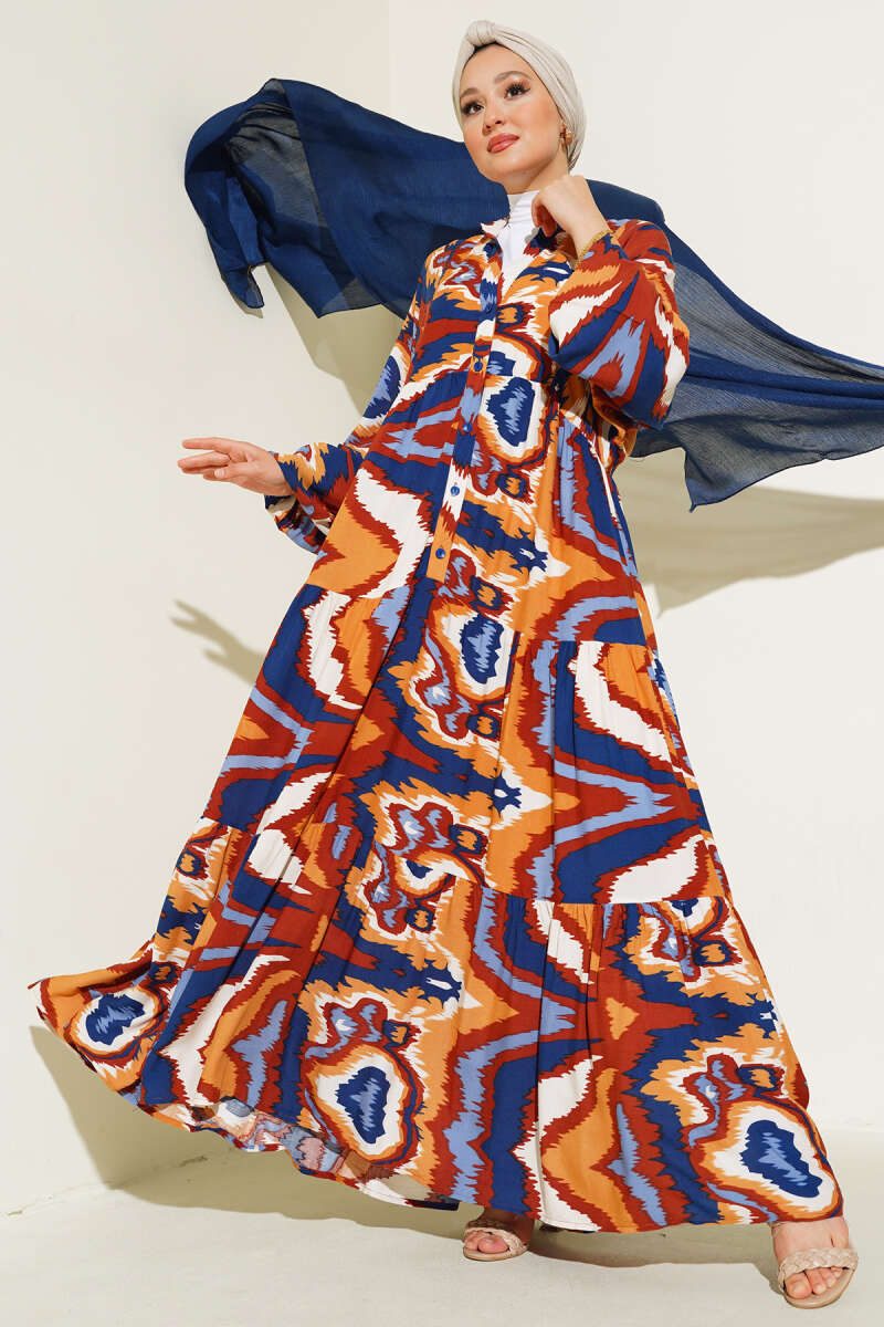 Etnik Desen Düğmeli Salaş Elbise Lacivert