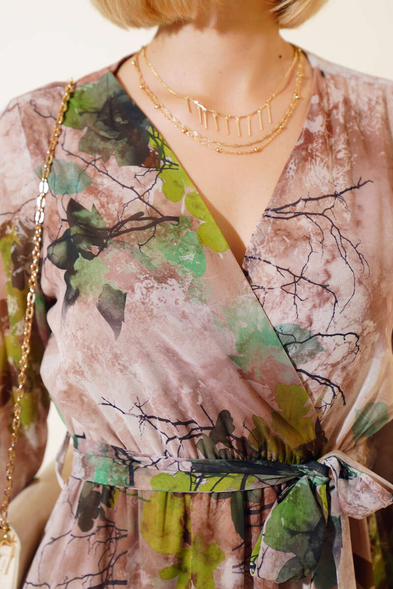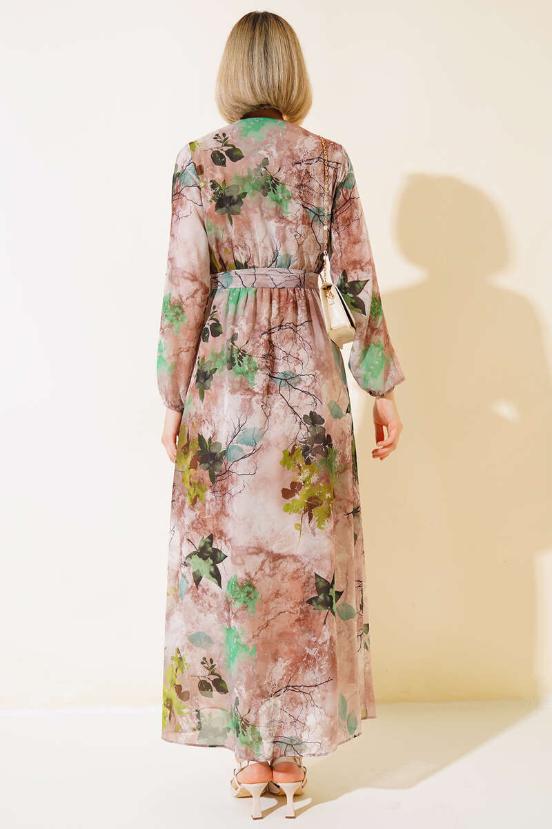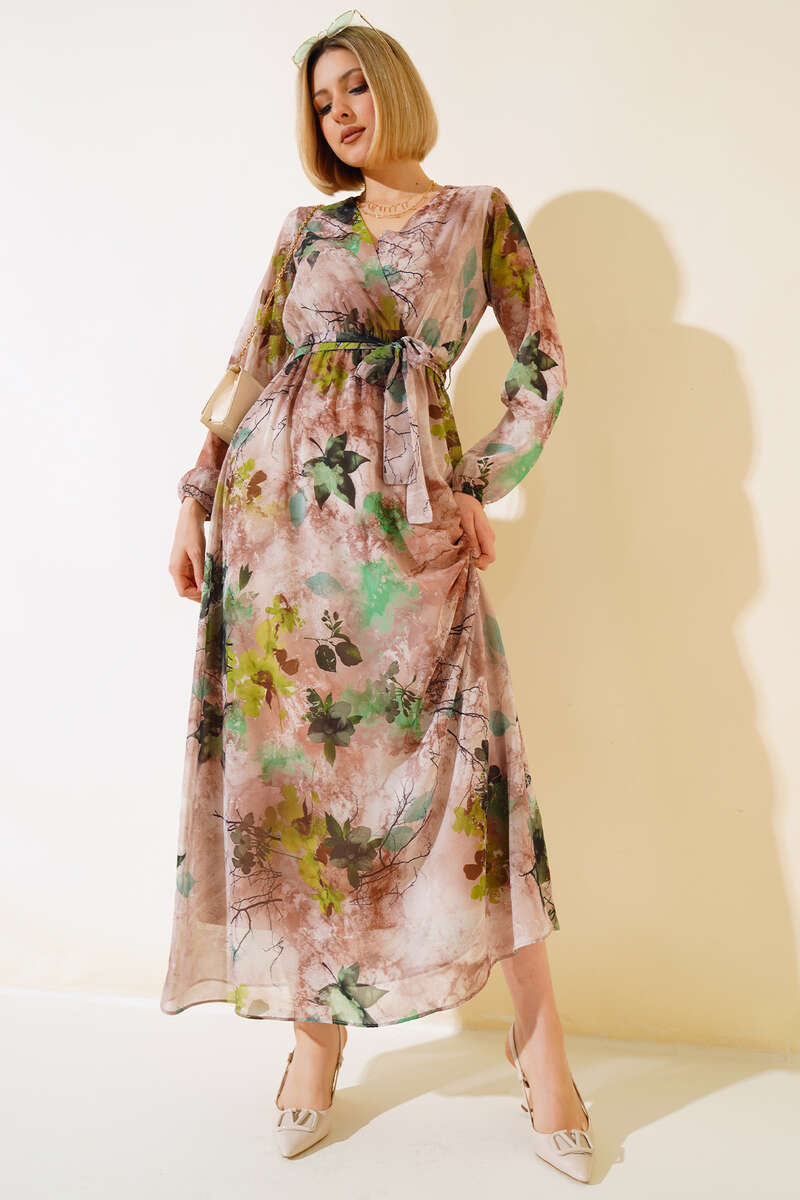Karışık Desen Kruvaze Yaka Elbise Yeşil
