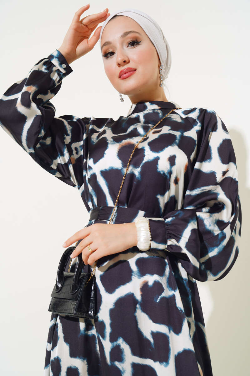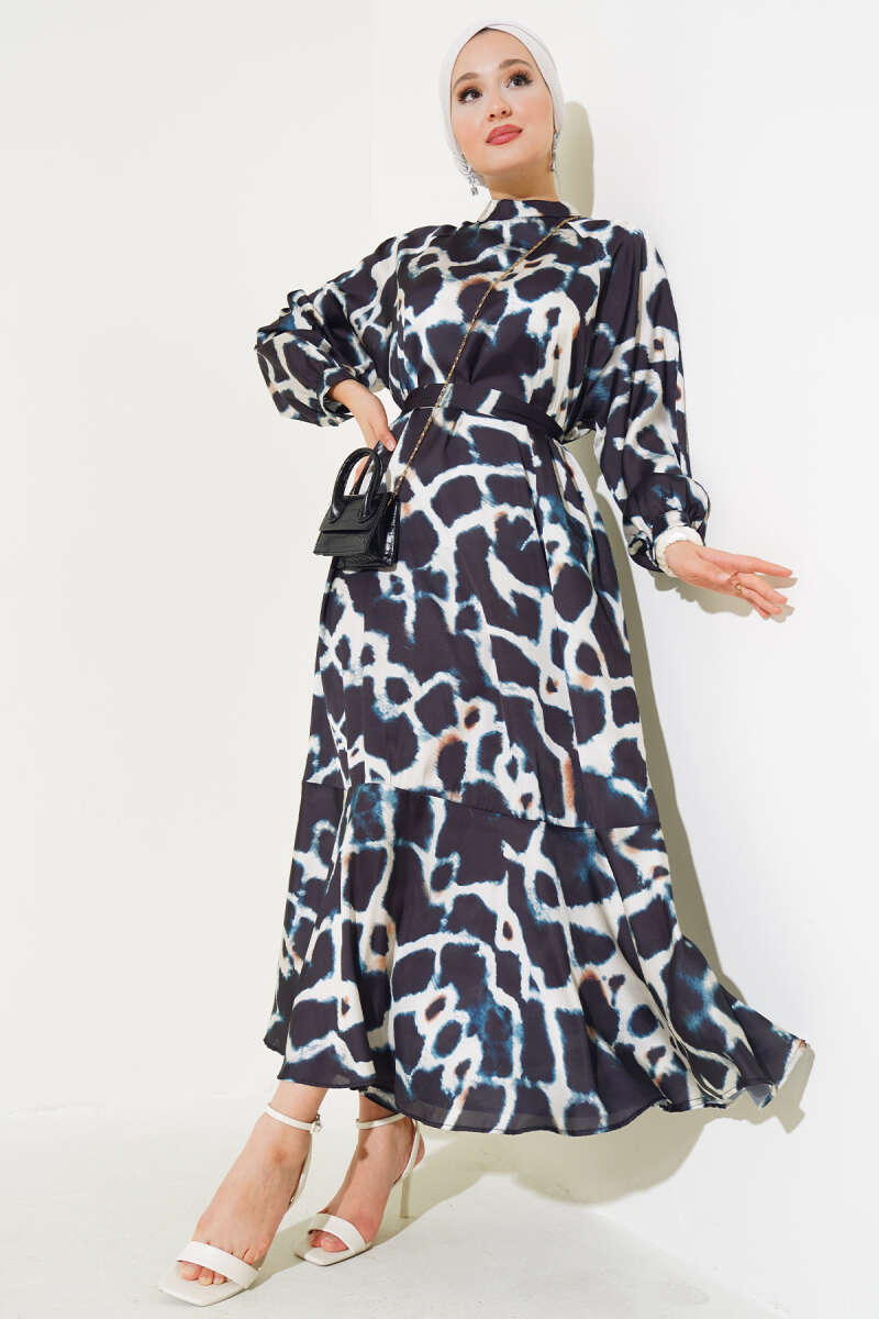 Paisley Desen Bel Lastikli Elbise Siyah
