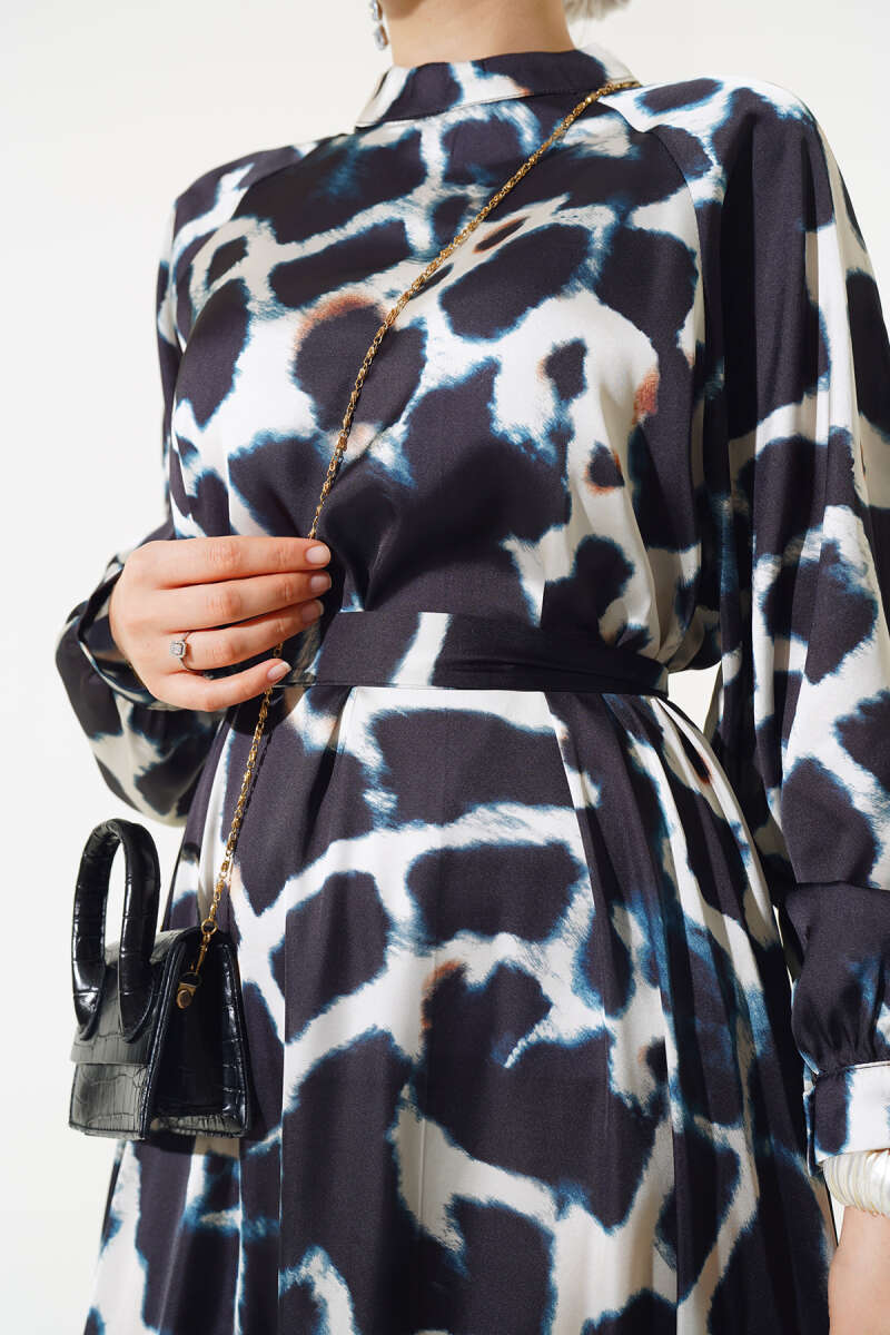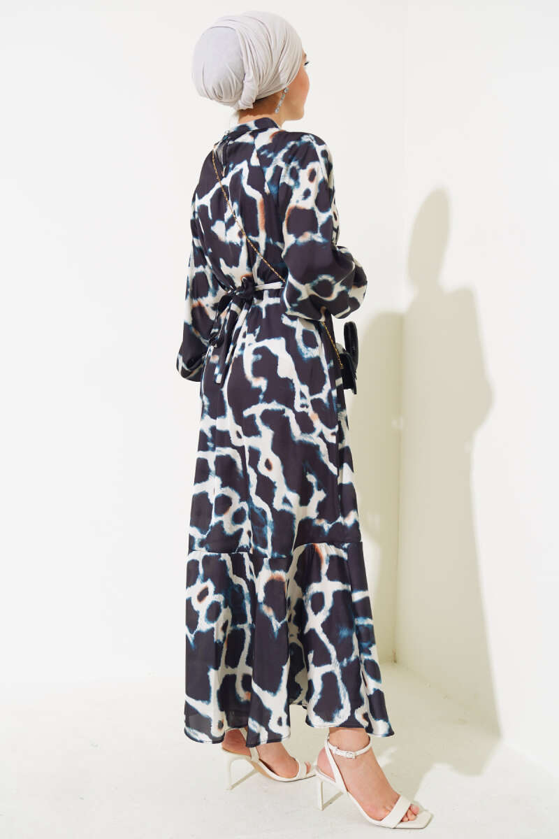 Paisley Desen Bel Lastikli Elbise Lacivert
