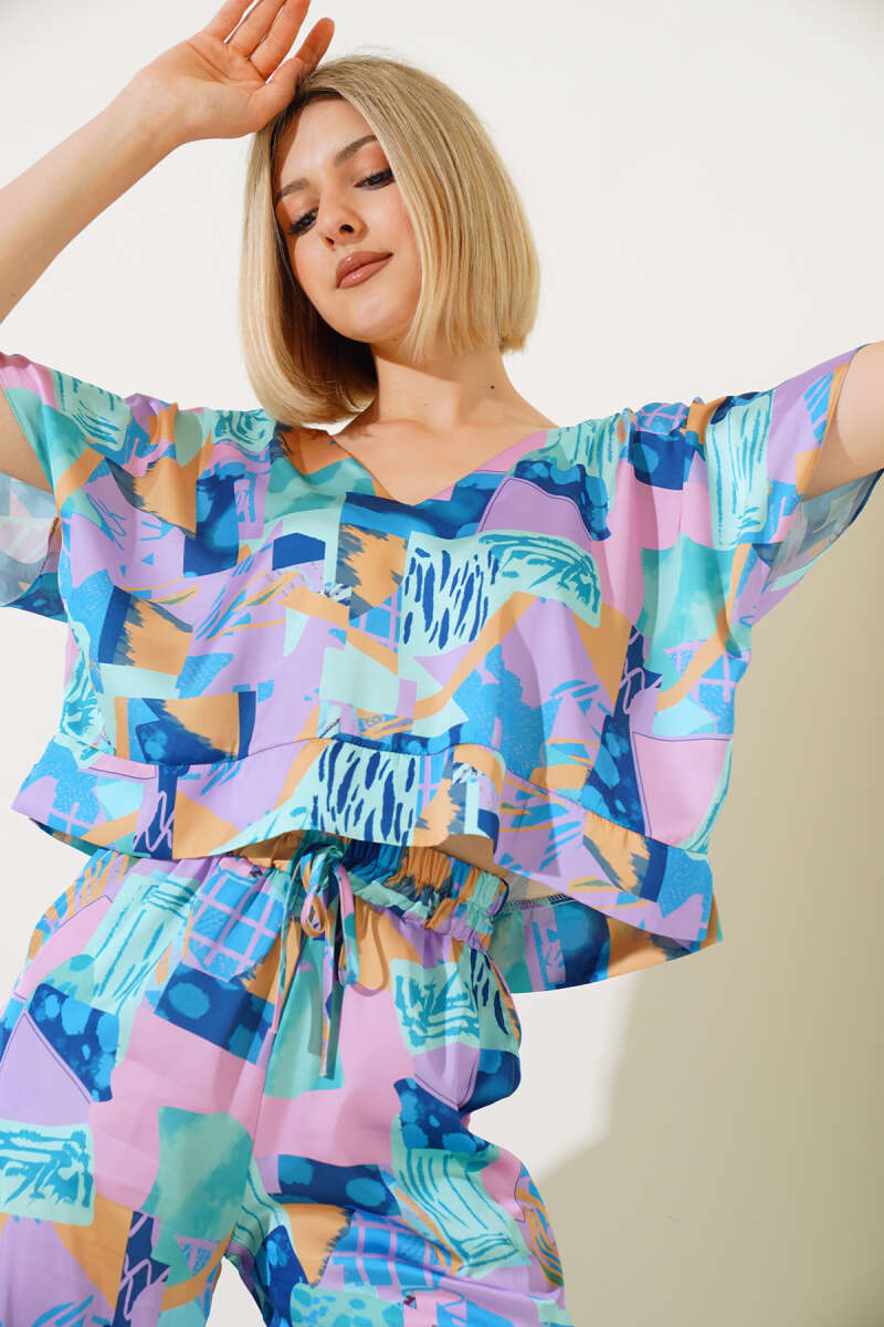 Metal Düğmeli Kısa Kol Kaşkorse Crop İkili Takım Lacivert
