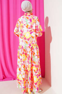 Karışık Desen Yarım Düğmeli Viskon Elbise Pudra