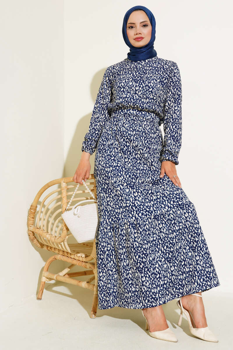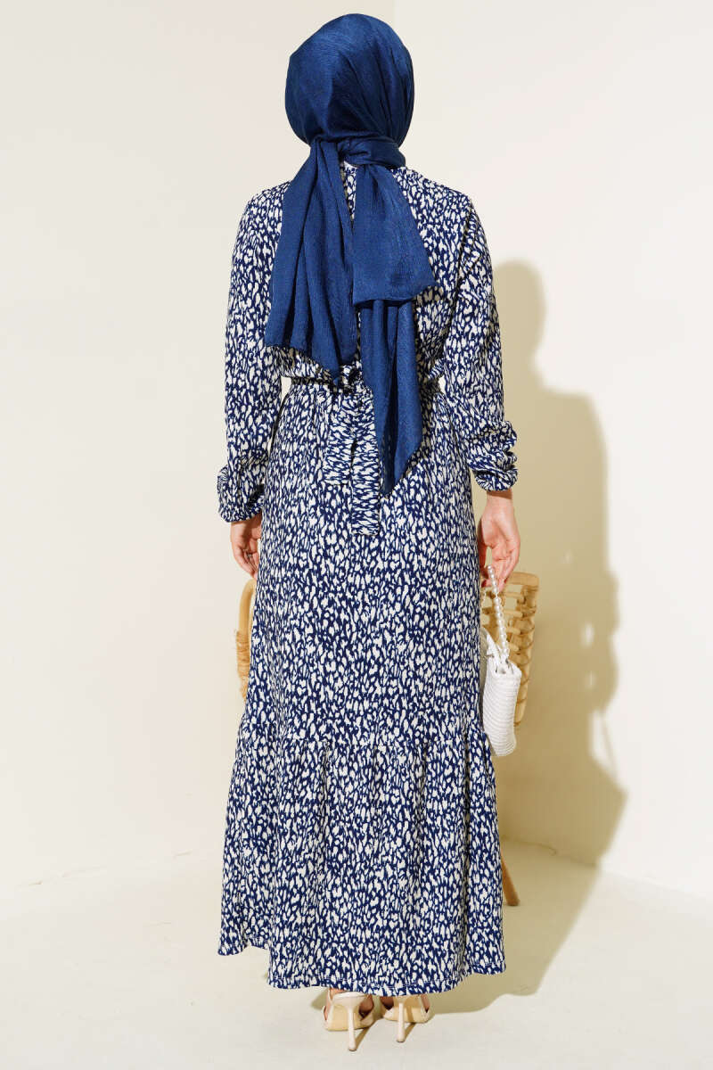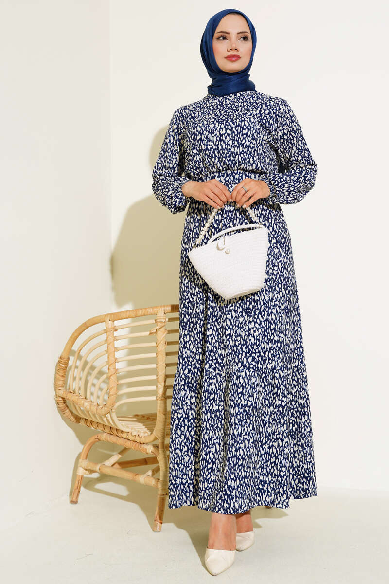 Karışık Desenli Bel Lastikli Bürümcük Elbise Lacivert