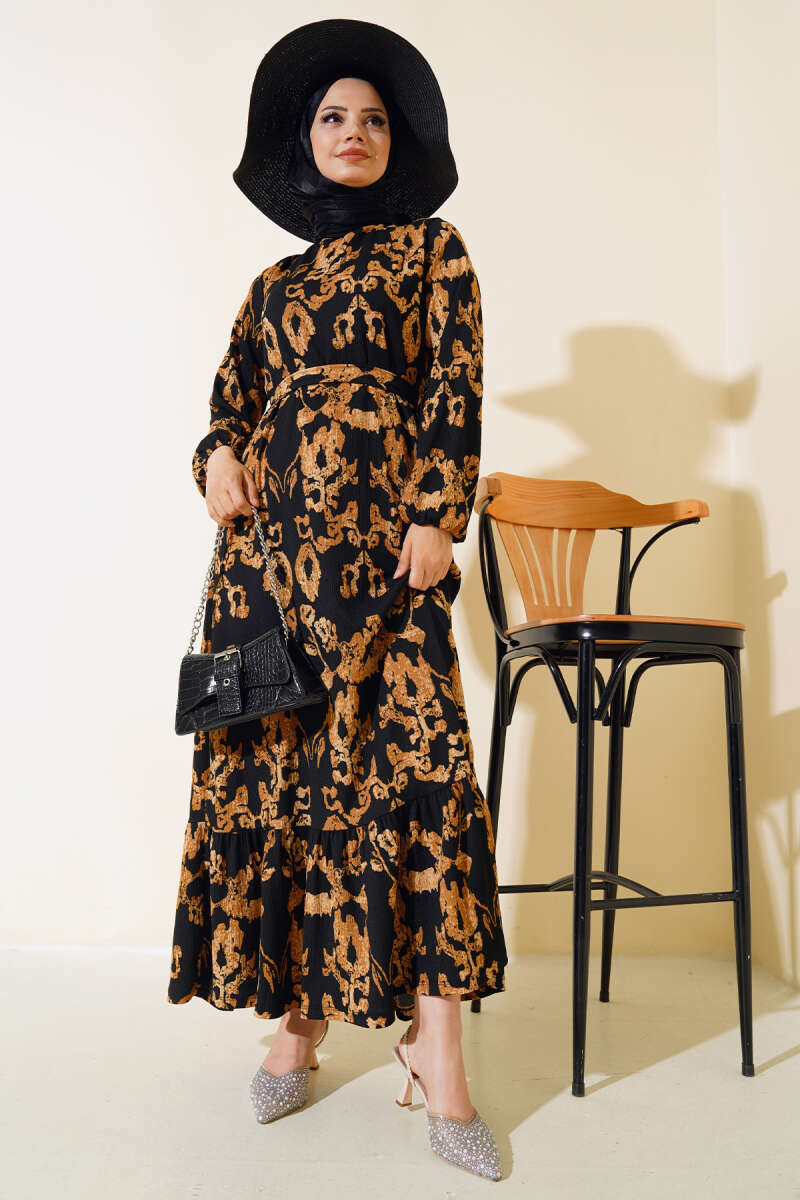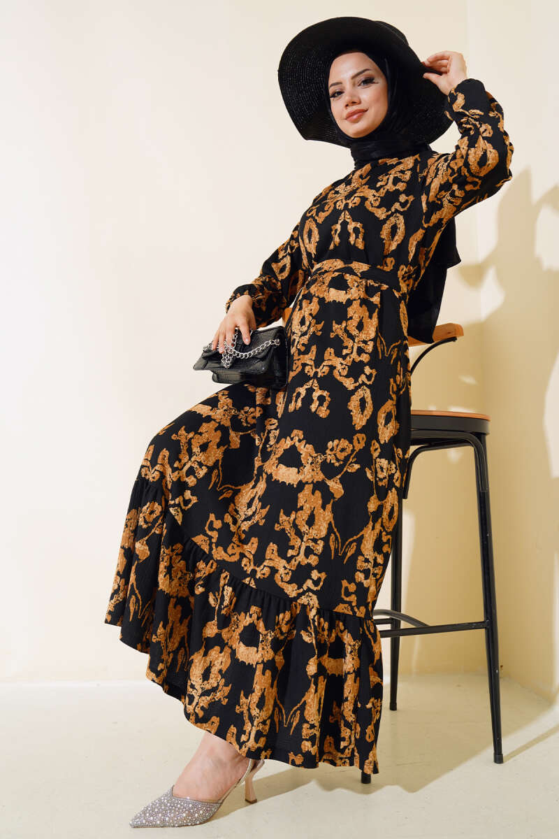Yanları Çapraz İp Bağlamalı Saten Elbise Acı Kahve