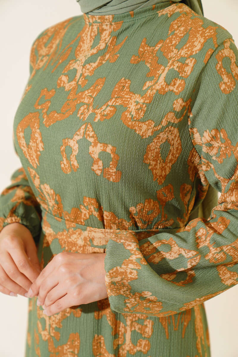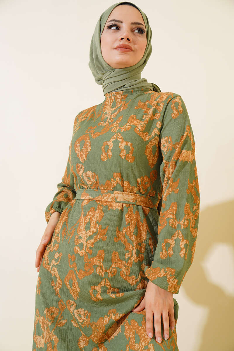 Karışık Desenli Kuşaklı Bürümcük Elbise Kahve