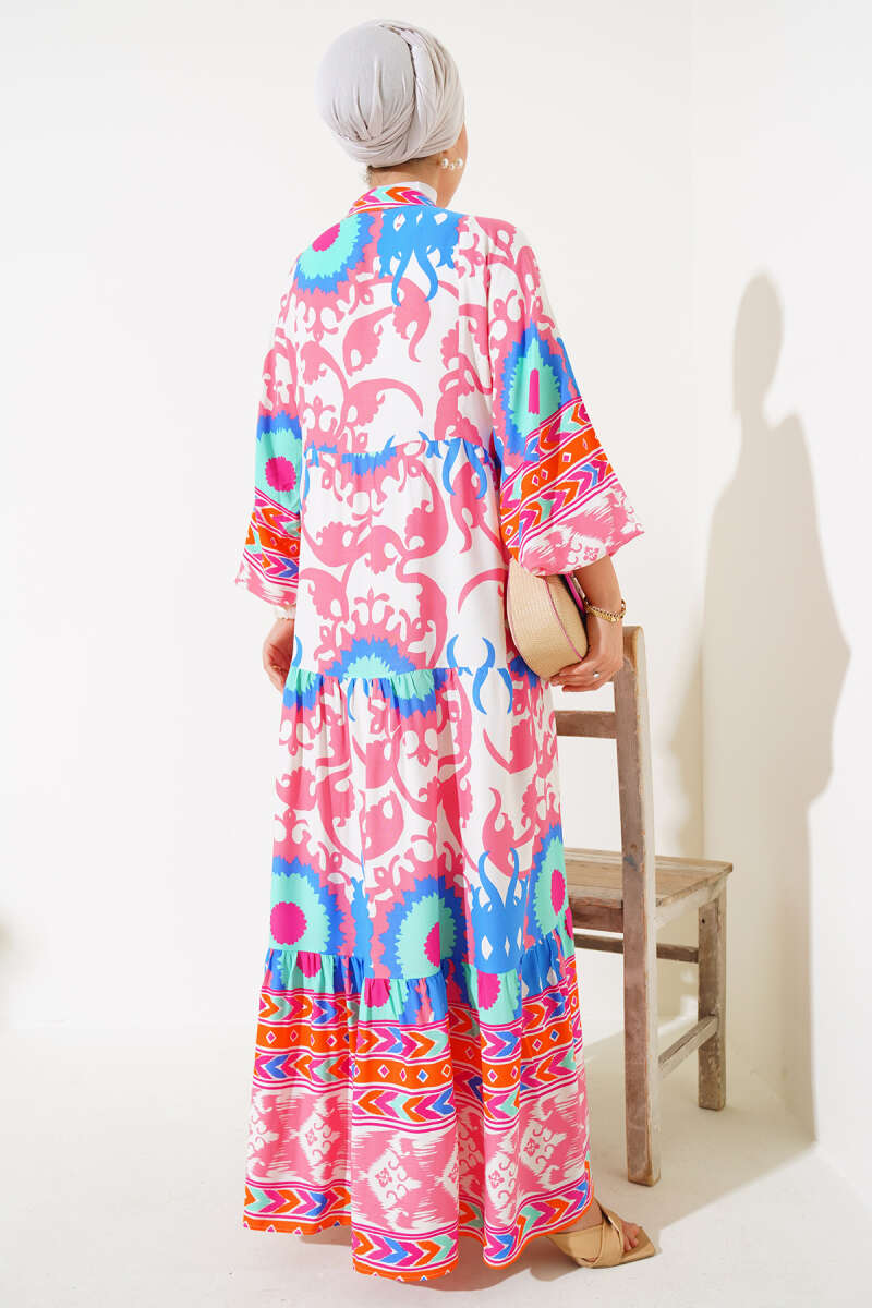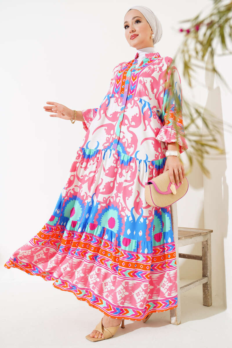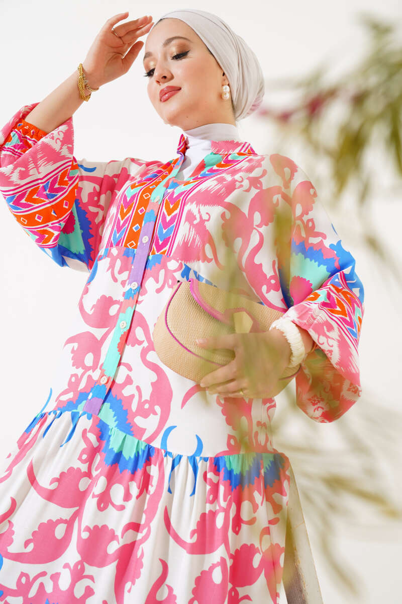 Kolları Boncuk Detaylı Kuşaklı Elbise Fuşya