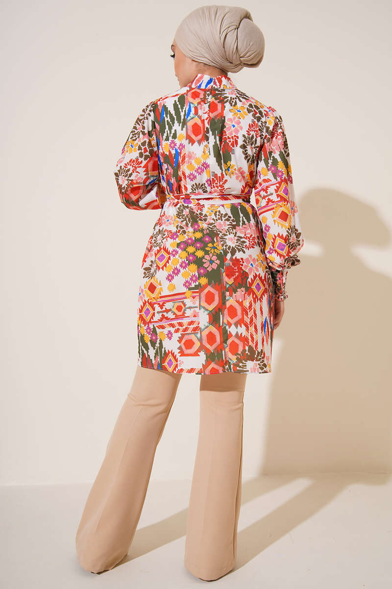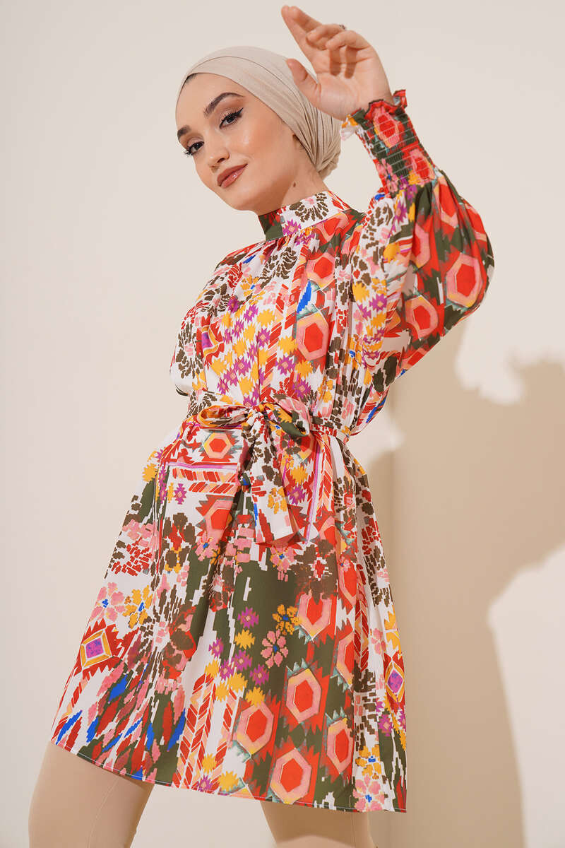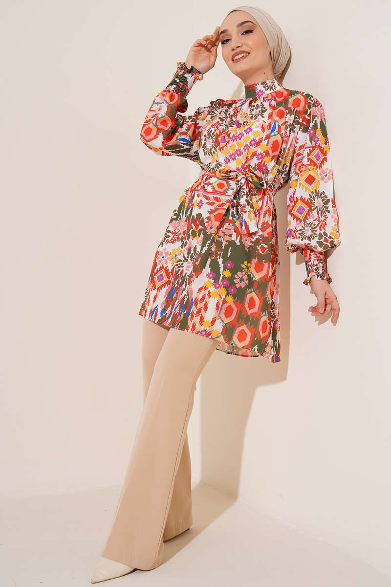Karma Desen Balon Kol Kuşaklı Tunik Haki Oranj
