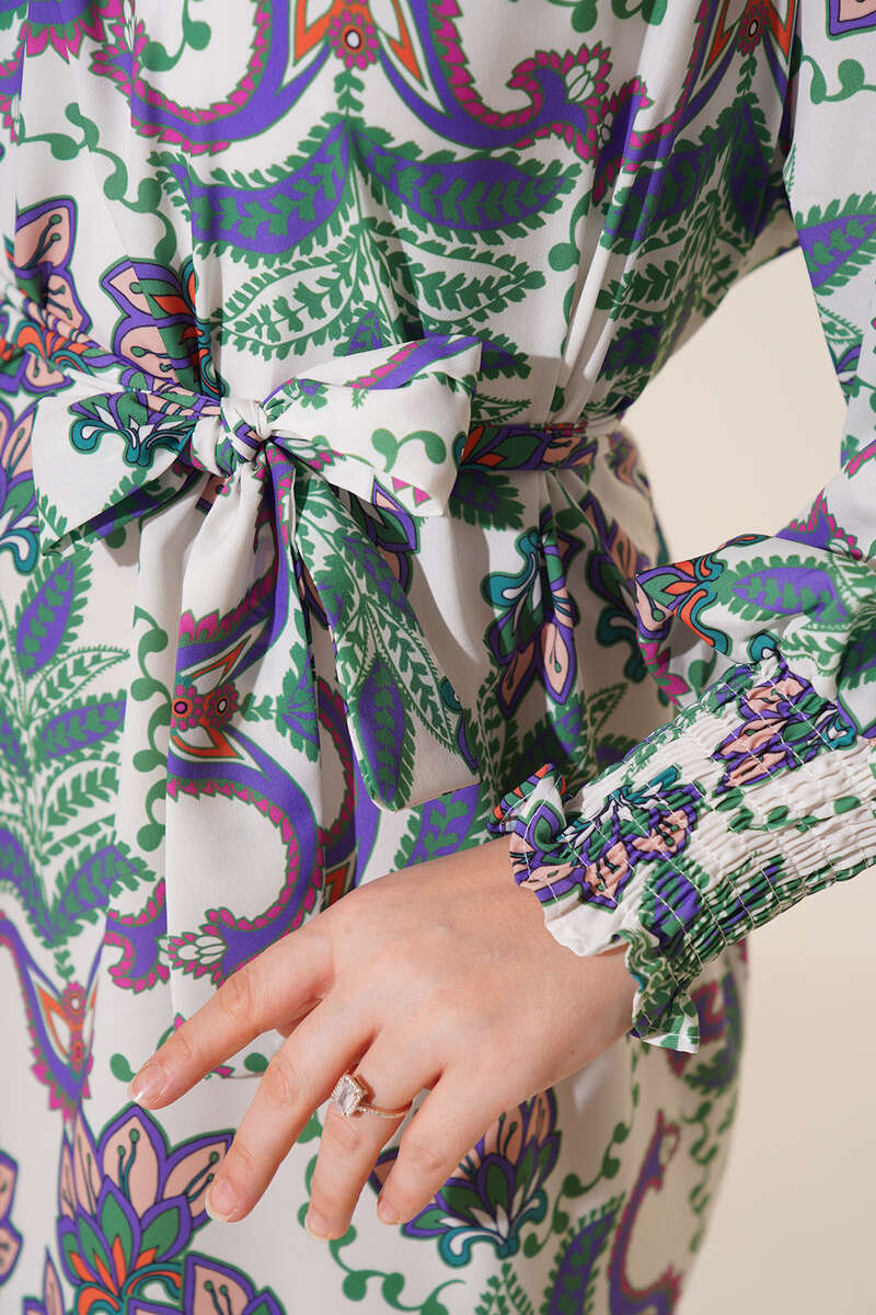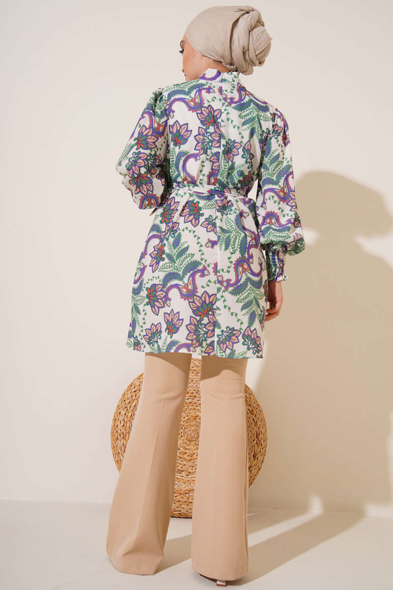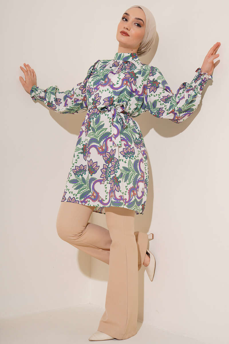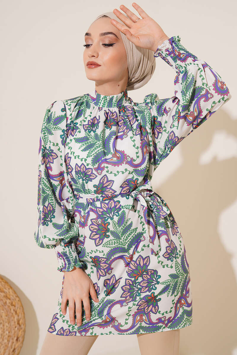 Karma Desen Balon Kol Kuşaklı Tunik Lila Yeşil