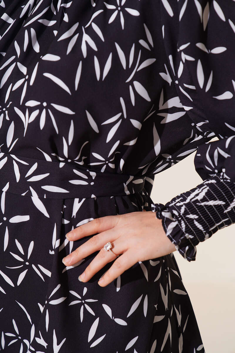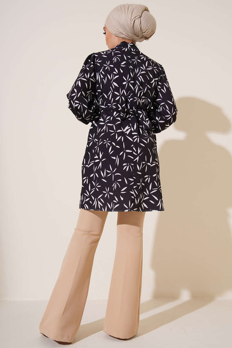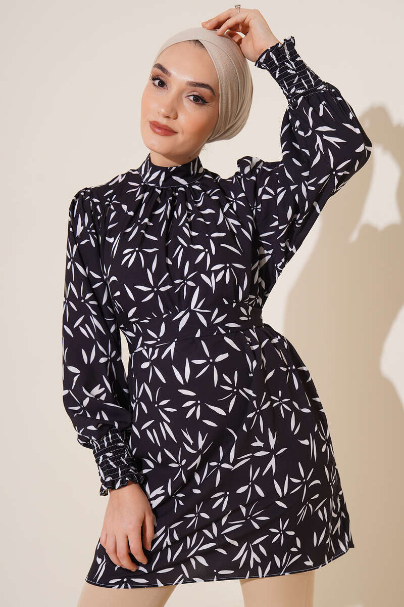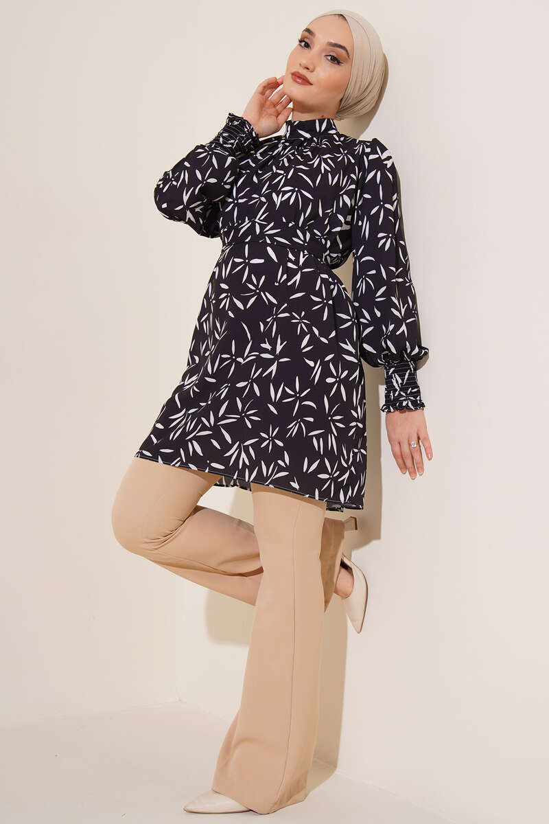 Karma Desen Balon Kol Kuşaklı Tunik Siyah