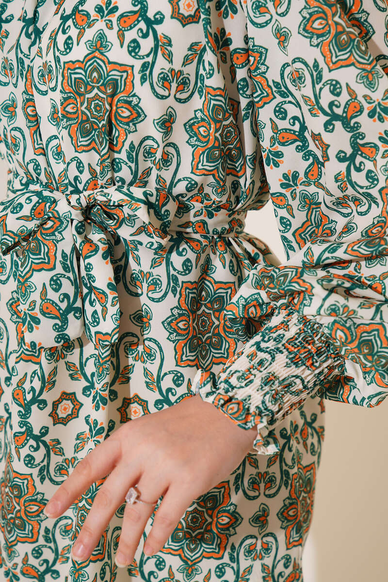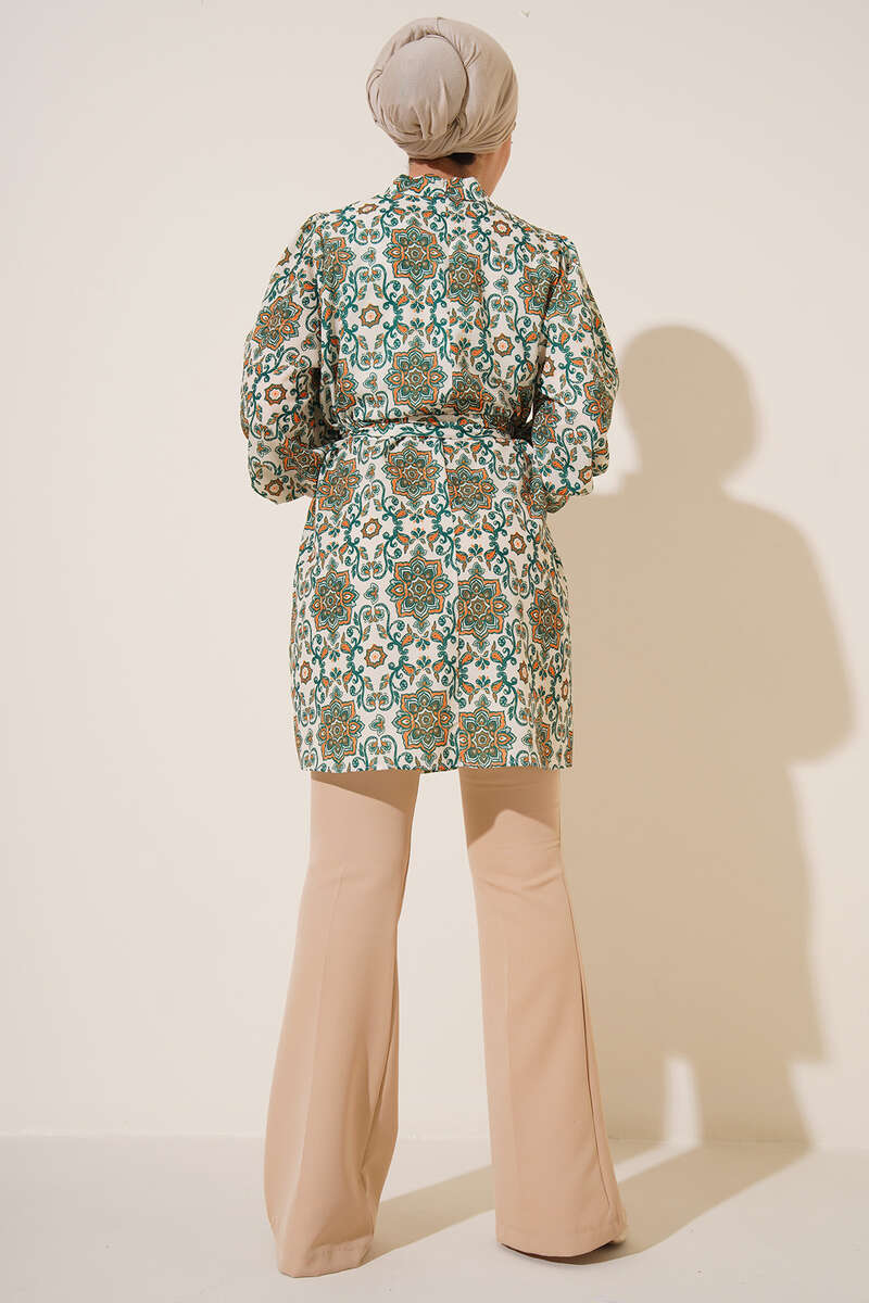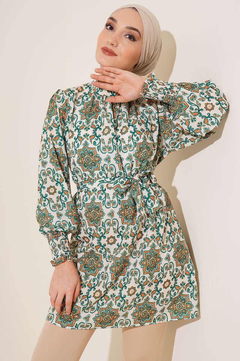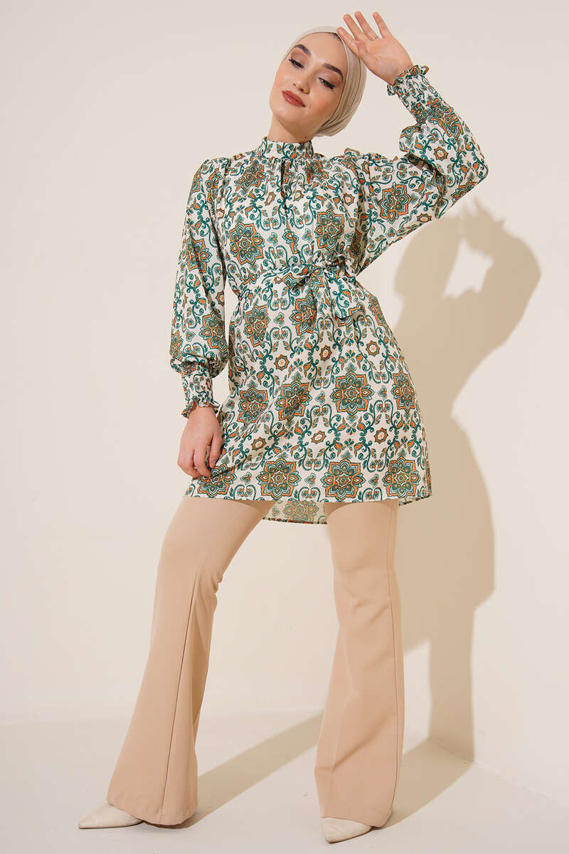 Karma Desen Balon Kol Kuşaklı Tunik Yeşil