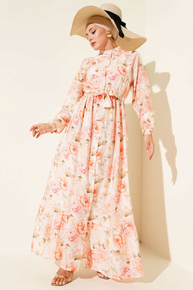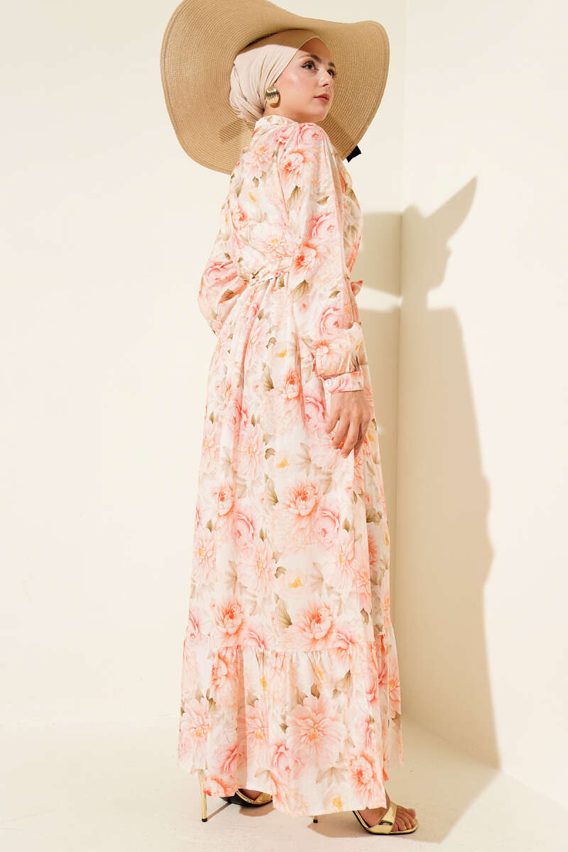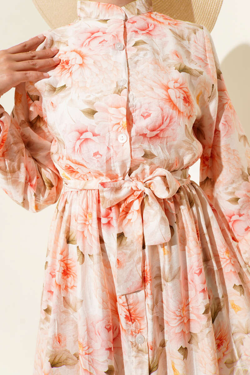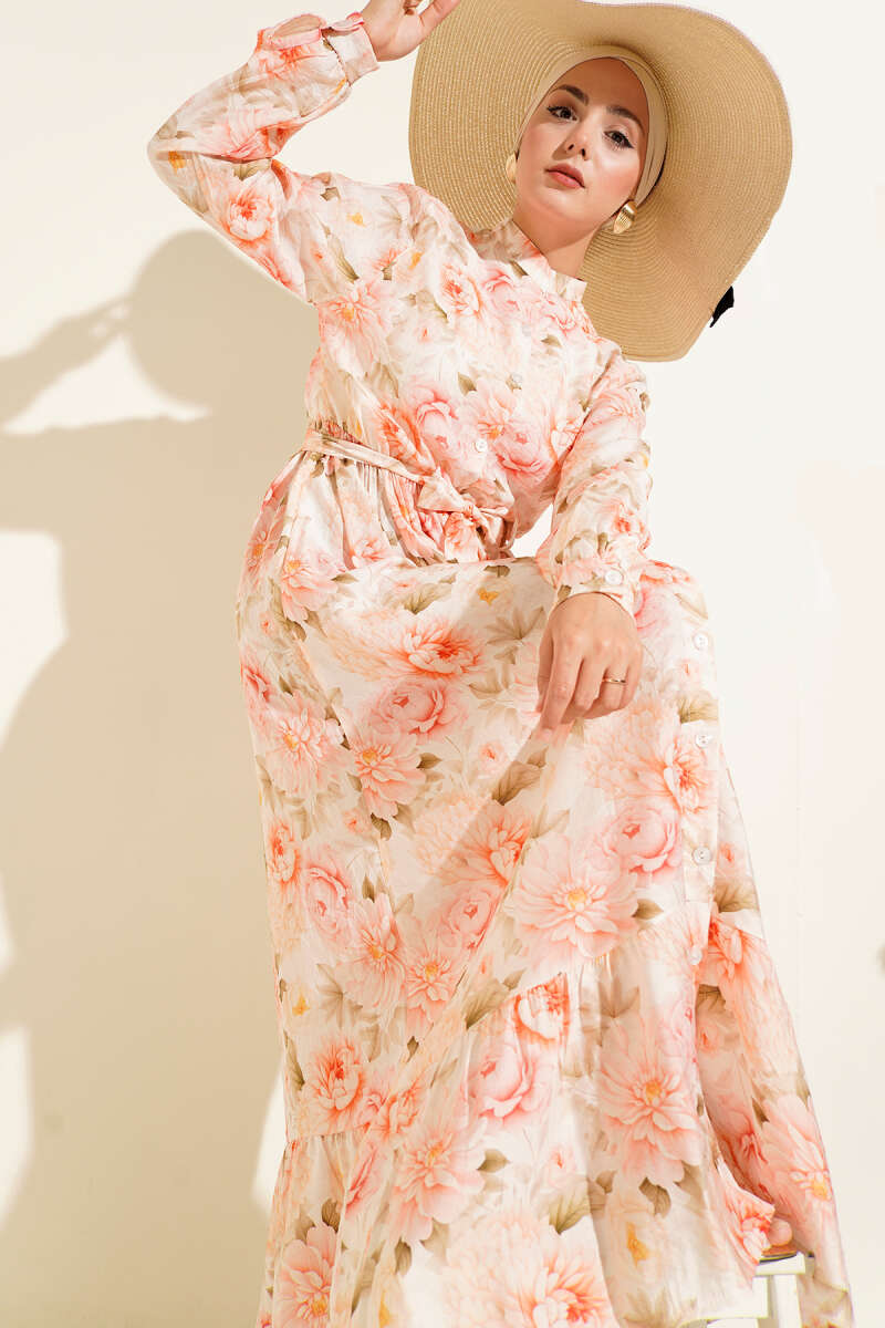 Çift İp Kuşaklı Ekoseli Elbise Bej