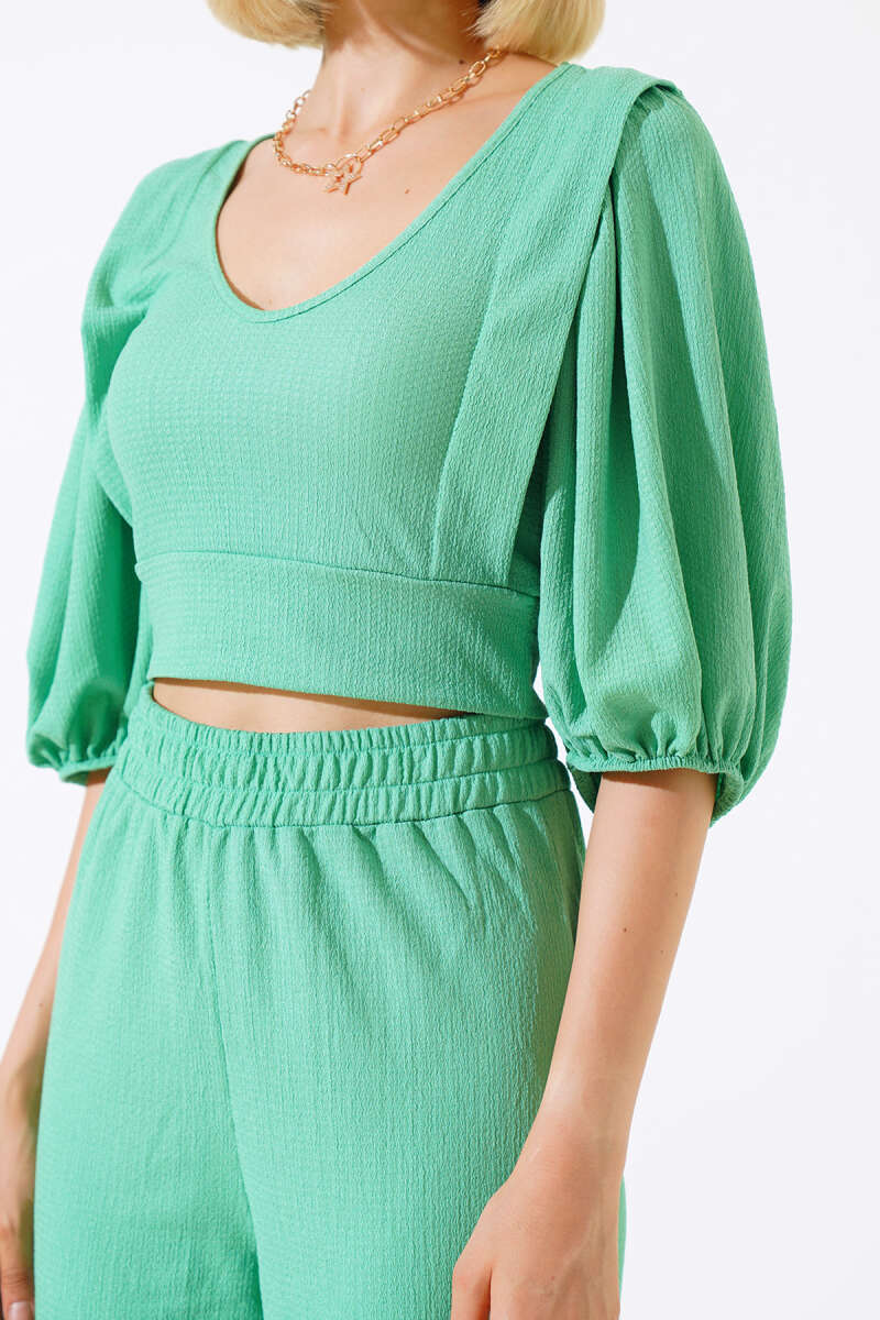 Omzu Çiçek Detaylı İkili Takım Mavi