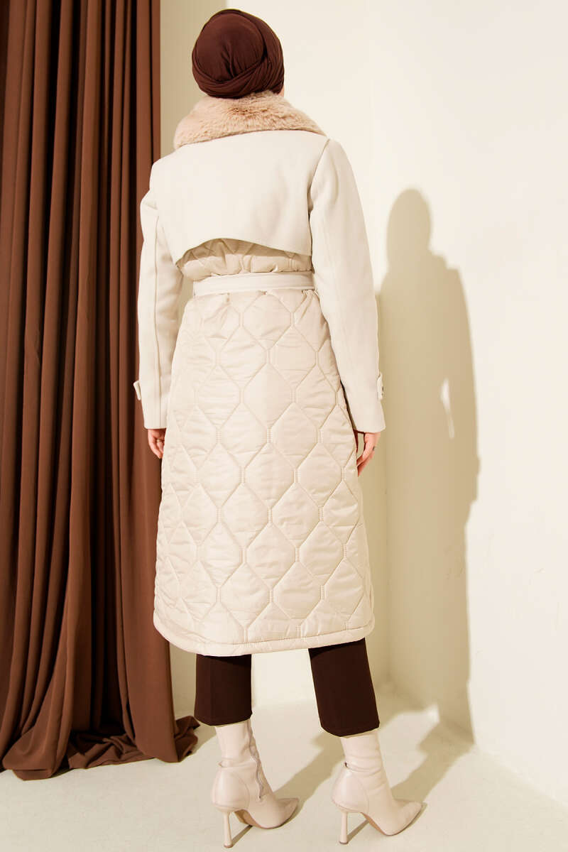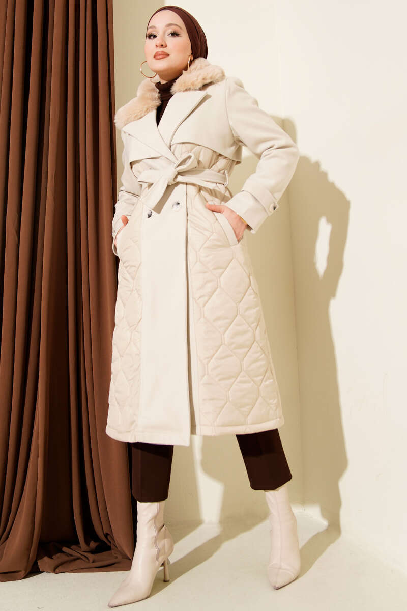 Kaşe Detaylı Yaka Kürklü Kapitone Mont Bej