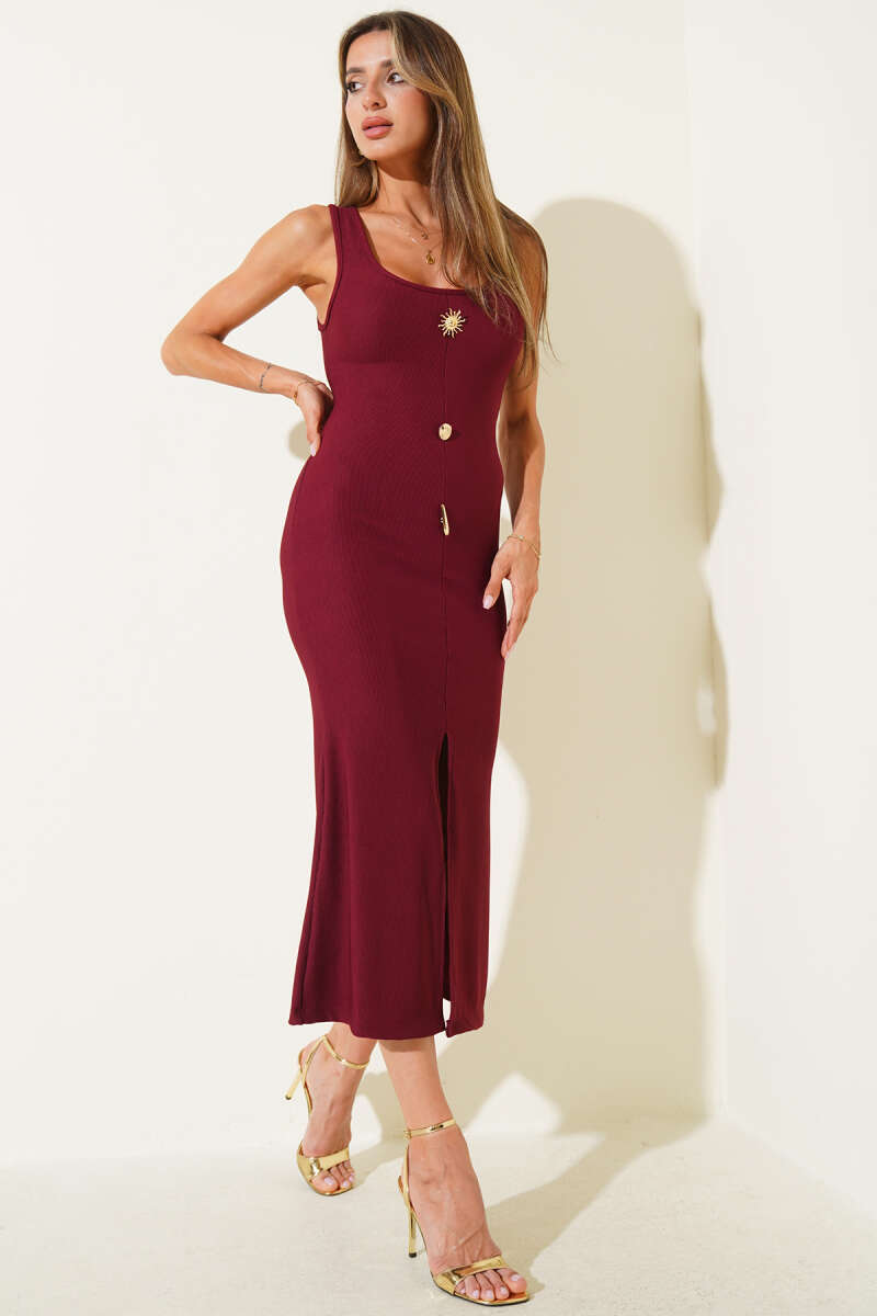Kaşkorse Gold Düğme Detaylı Elbise Bordo