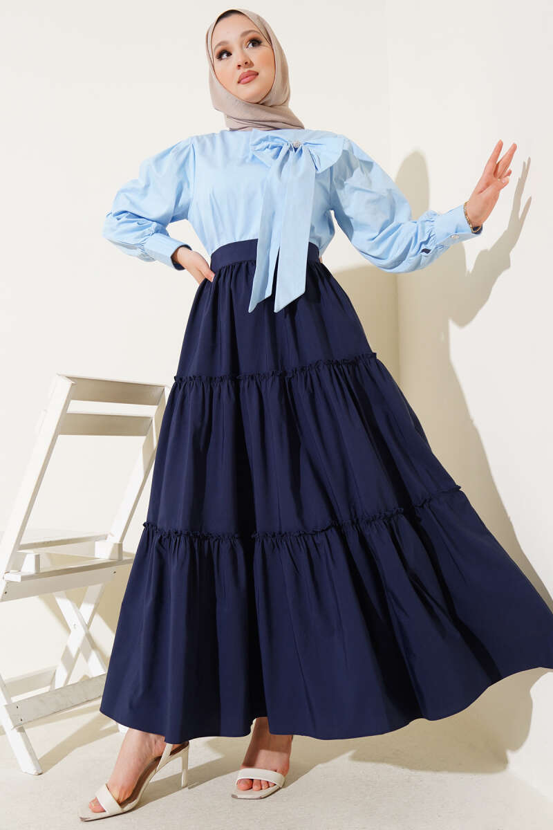 Kemerli Pileli Kloş Etek Lacivert