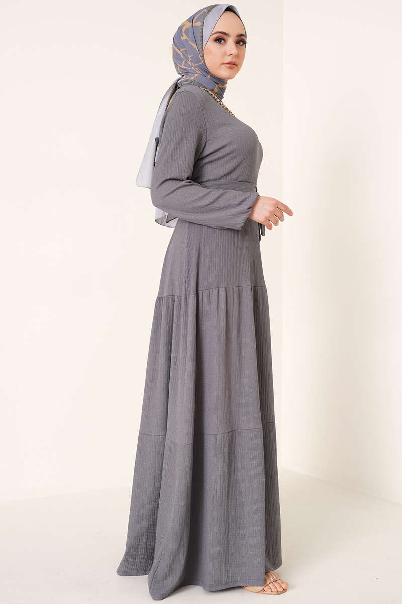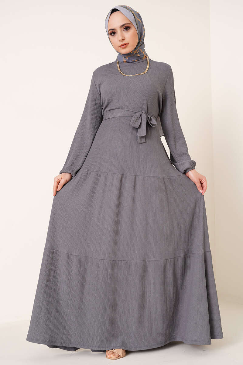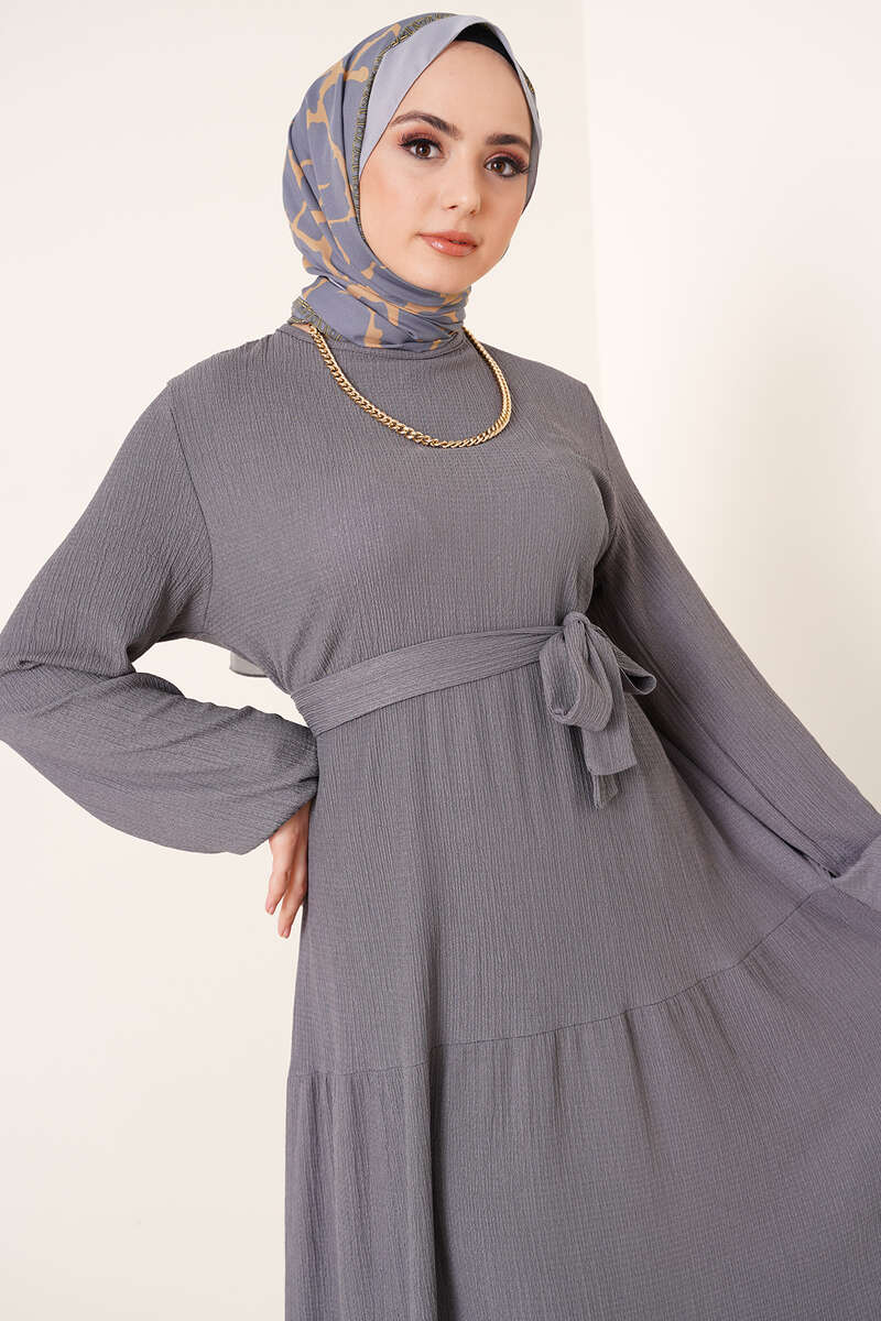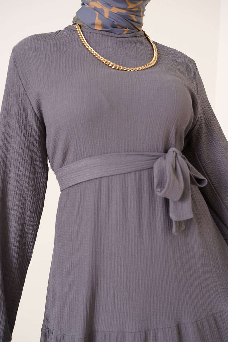 Önden Bağlama Detaylı Lastikli Elbise Gri