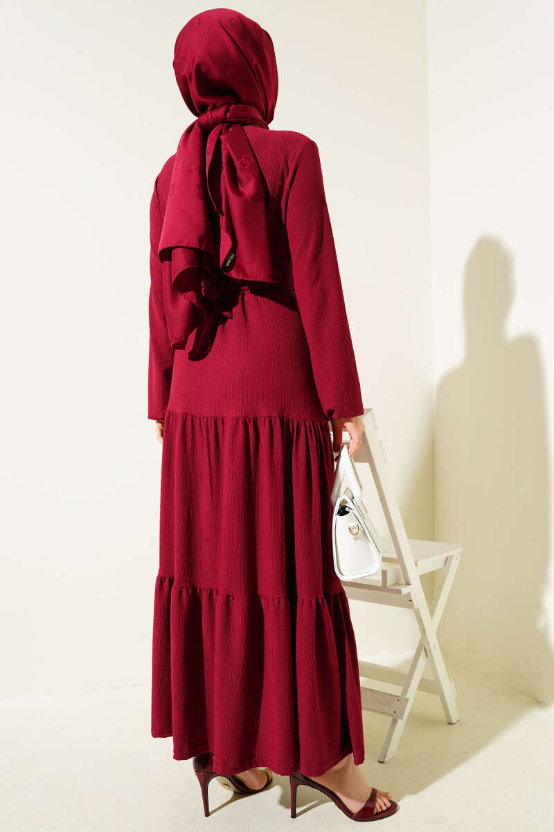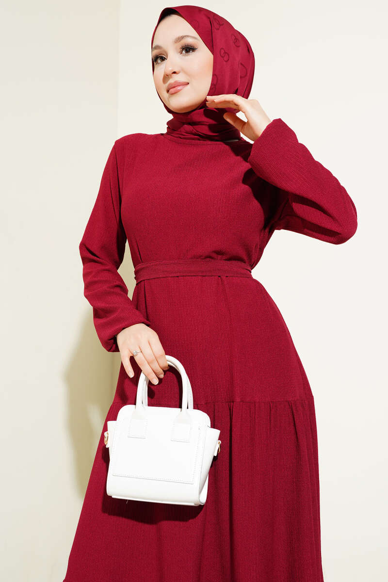 Balon Kol Kemerli Basic Elbise Bordo