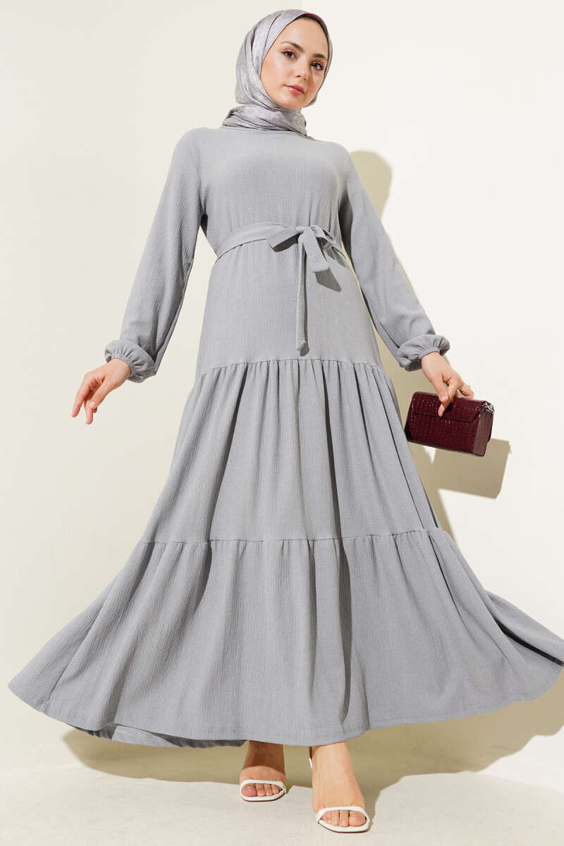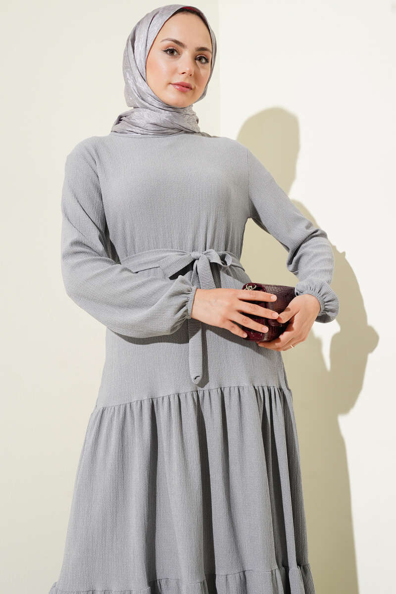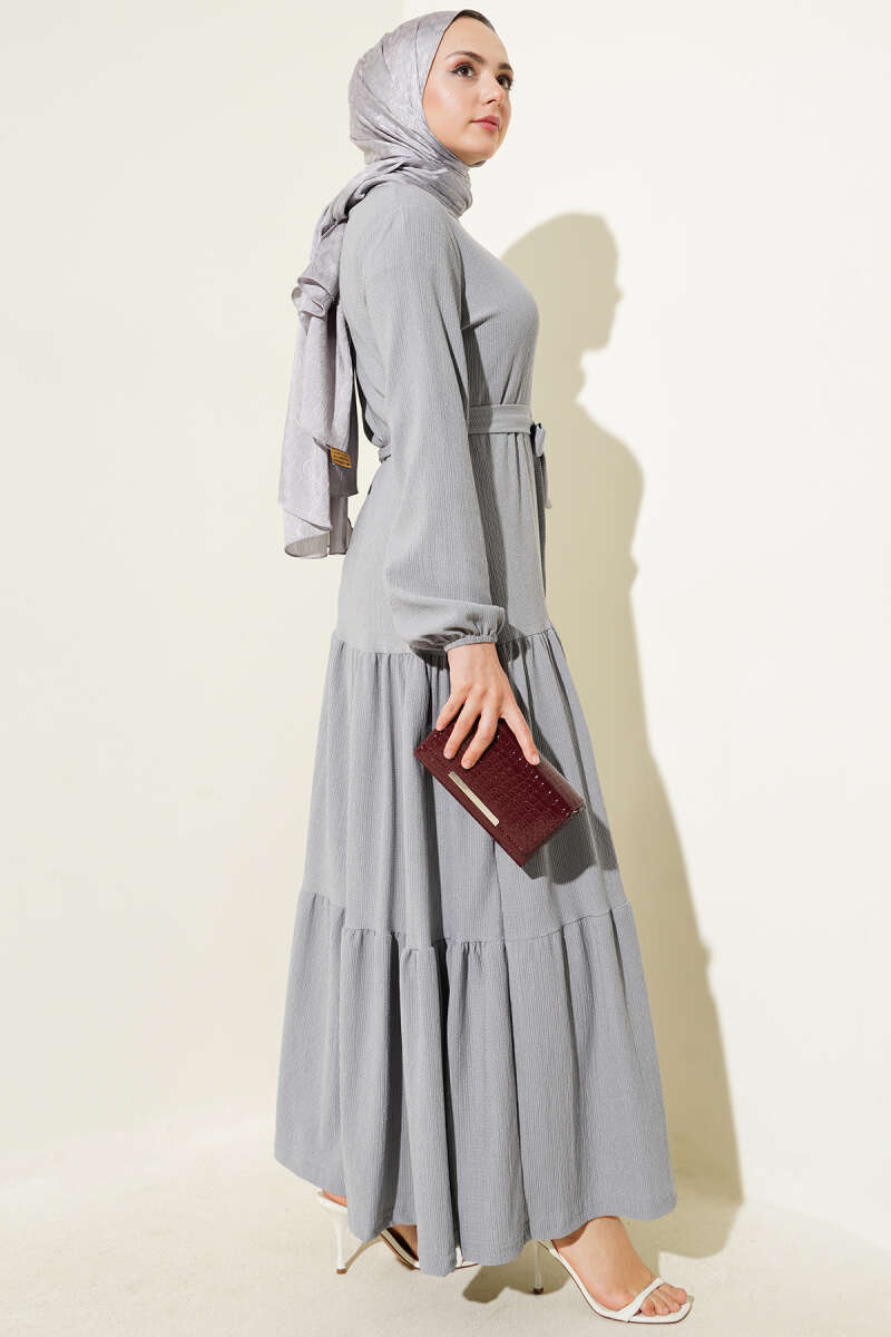 Kat Kat Bürümcük Kuşaklı Elbise Gri